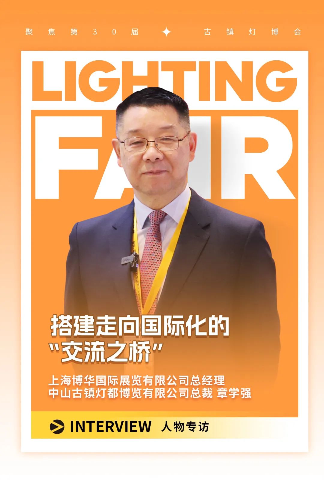 2024年3月18—21日,共筑超150万平方米,超3500家优质企业的第30届古镇灯博会即将荣耀启程。在展会即将举办之际,古镇灯饰传媒采访了展会管理方负责人——上海博华国际展览有限公司总经理、中山古镇灯都博览有限公司总裁章学强,以第30届古镇灯博会为注脚,回首古镇灯博会的专业化、市场化、国际化之路。
