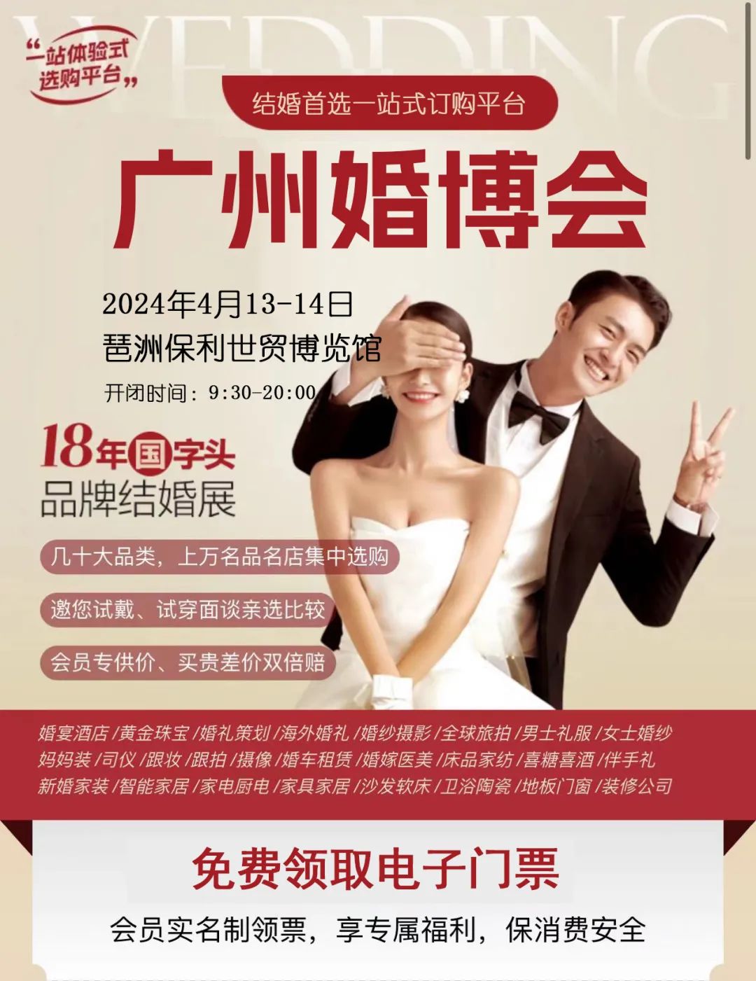 广州婚博会展出品类包括:婚纱照、婚宴酒店、婚庆婚礼策划、四大金刚、婚戒三金五金、婚纱礼服、新郎西装、喜糖喜酒伴手礼、新婚家纺、婚车租赁……全都有,现场挑选、谈单、订单一站式全搞定!