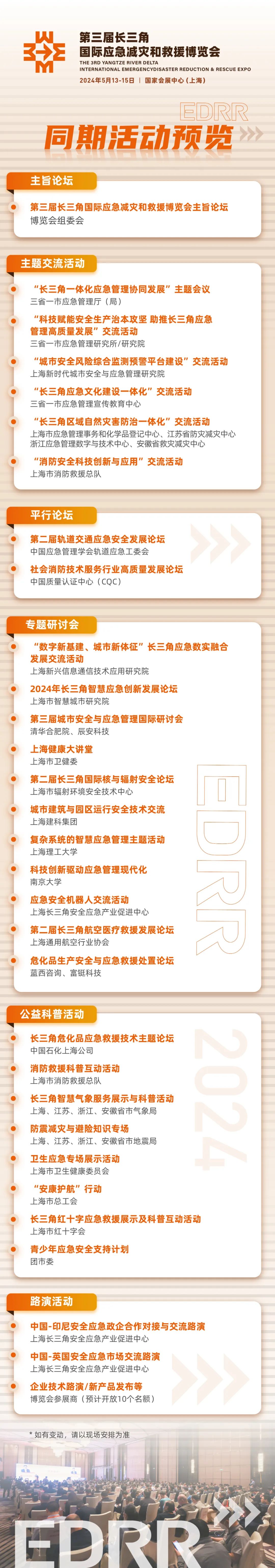 为认真贯彻习近平总书记关于应急管理和防灾减灾救灾的重要论述,落实长三角一体化发展国家战略部署,推进长三角区域应急管理协同发展,深化应急管理交流合作,提升应急防灾减灾和救援能力,营造全社会关心应急、支持应急、参与应急的浓厚氛围,由上海、江苏、浙江、安徽三省一市应急管理厅局联合上海市国际贸易促进委员会共同主办、华茂国际展览(上海)有限公司承办的第三届长三角国际应急减灾和救援博览会,将于2024年5月13-15日在国家会展中心(上海·虹桥)举行。