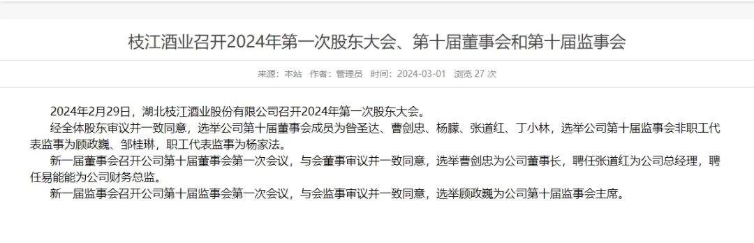 2024年2月29日,湖北枝江酒业股份有限公司召开2024年第一次股东大会。