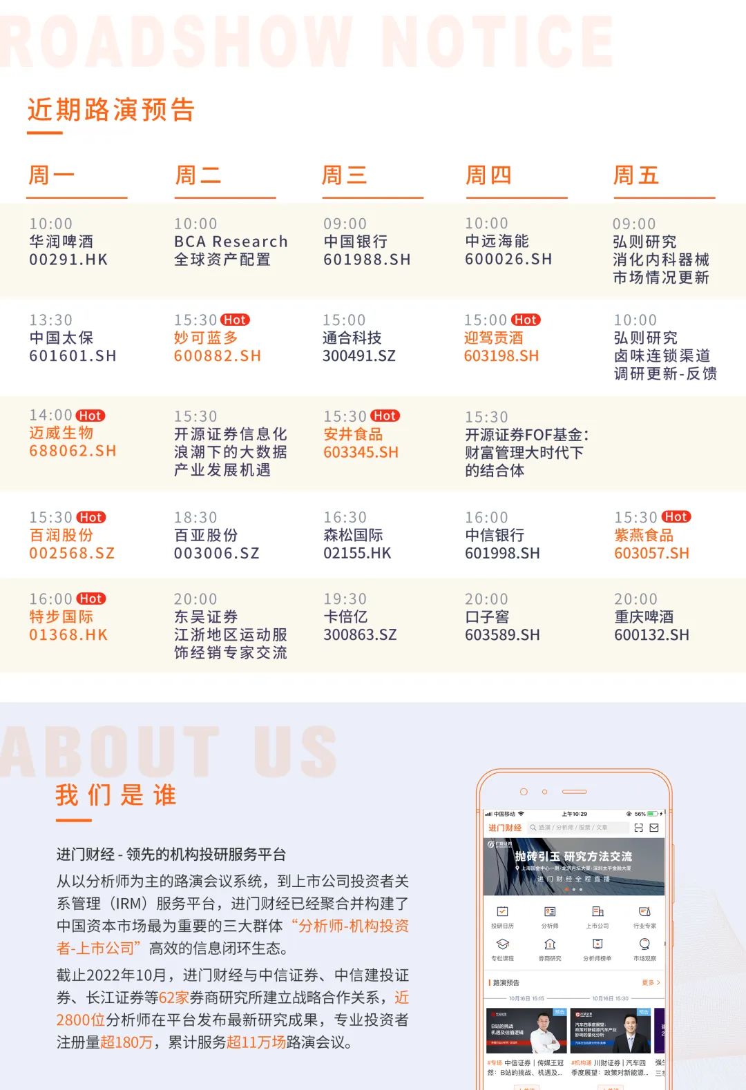 本周路演预告|银行、食饮多行业调研交流,及中金带来a股&港股市场2023展望