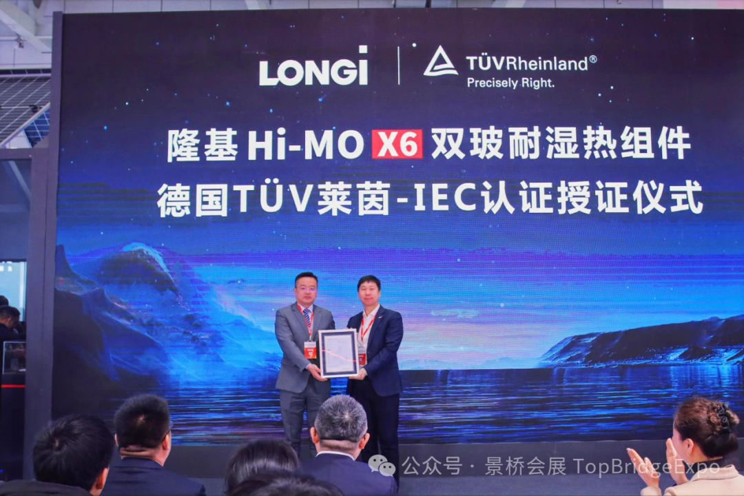 本次隆基推出的Hi-MO X6双玻耐湿热组件是以隆基自研的HPBC技术为基础,具有外表美观、转换率高、安全可靠、耐湿热等特点。本次新品发布会上,TÜV莱茵大中华区太阳能与商业产品服务光伏组件副总经理冯轶洲为隆基颁发Hi-MO X6双玻耐湿热组件IEC证书,再次印证了该组件的耐湿热和低衰减性能。