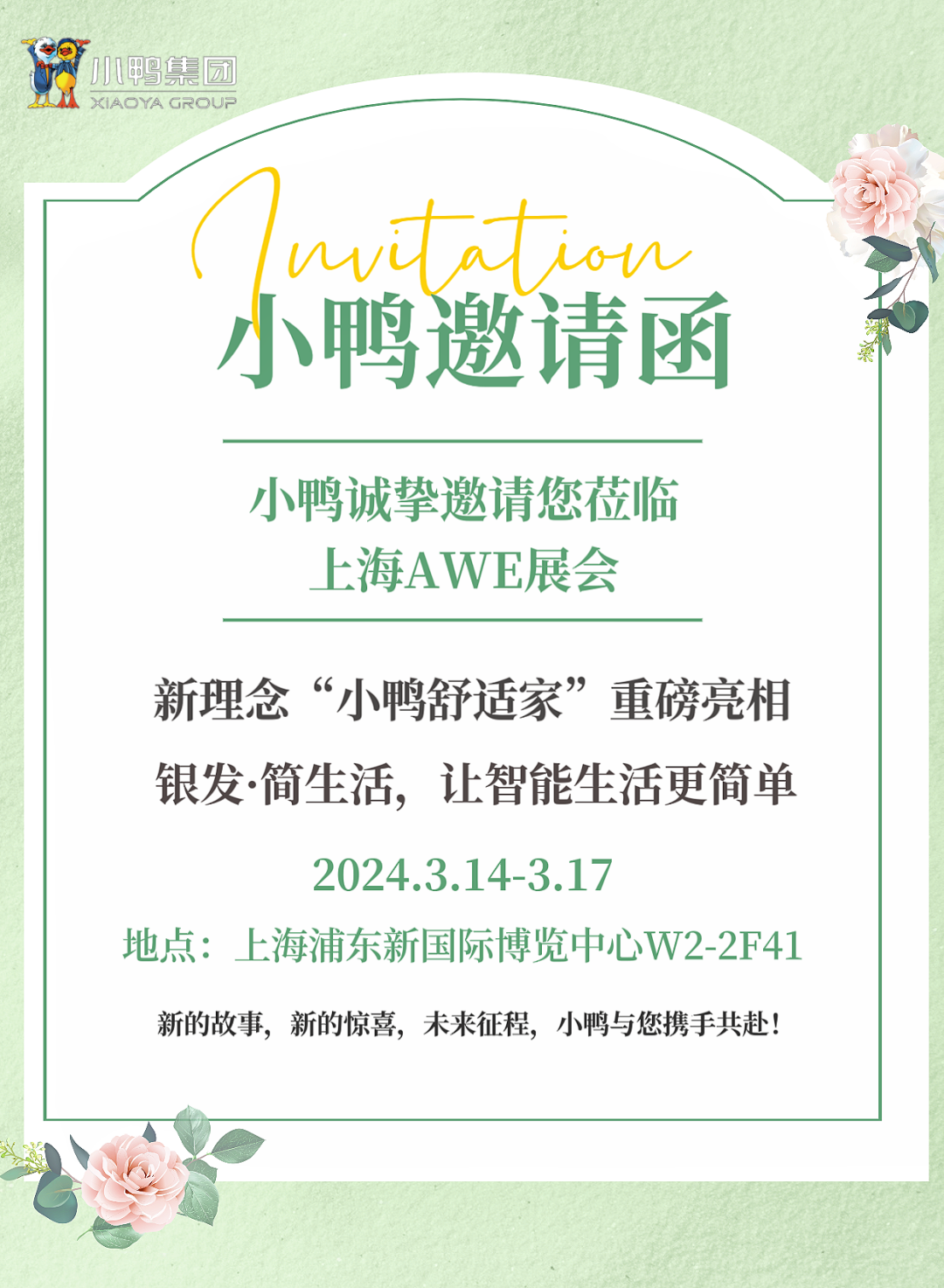想要了解我们更多吗?请关注3月14日-17日在上海浦东新国际博览中心隆重举行的中国家电及消费电子博览会(AWE),小鸭将在W2-2F41展位参展等待您的莅临。