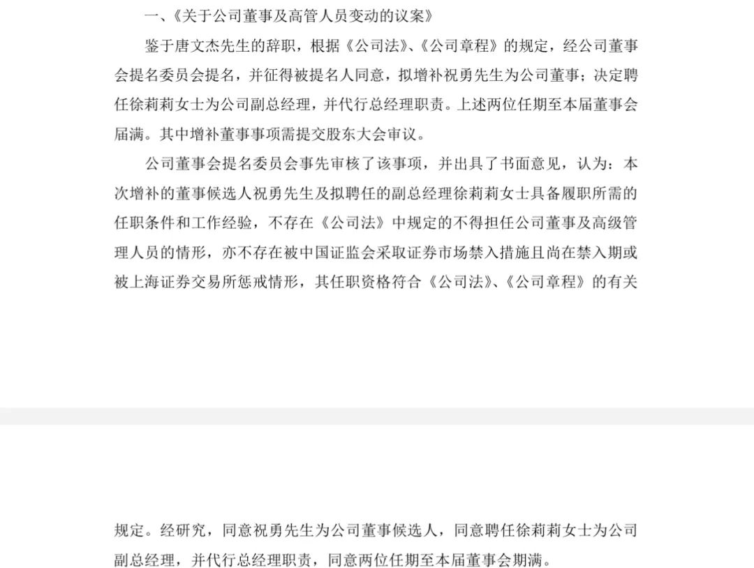 鉴于唐文杰的辞职,拟增补祝勇为公司董事;决定聘任徐莉莉为公司副总经理,并代行总经理职责。上述两位任期至本届董事会届满。其中增补董事事项需提交股东大会审议。
