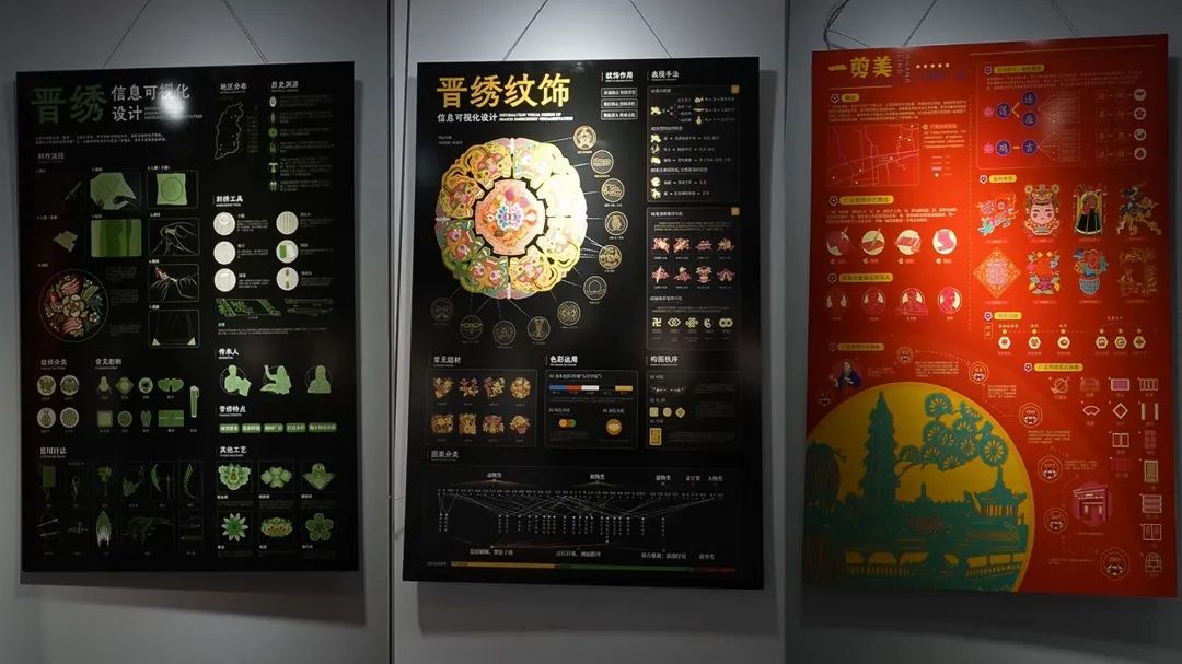 在非遗视觉设计作品展上,众多山西非遗项目通过信息可视化设计全景式地徐徐展开。每个非遗项目均链接了历史沿革、工艺特点、传承谱系、制作流程、色彩应用等。在这里,别具特色的山西非遗显得更加活色生香。