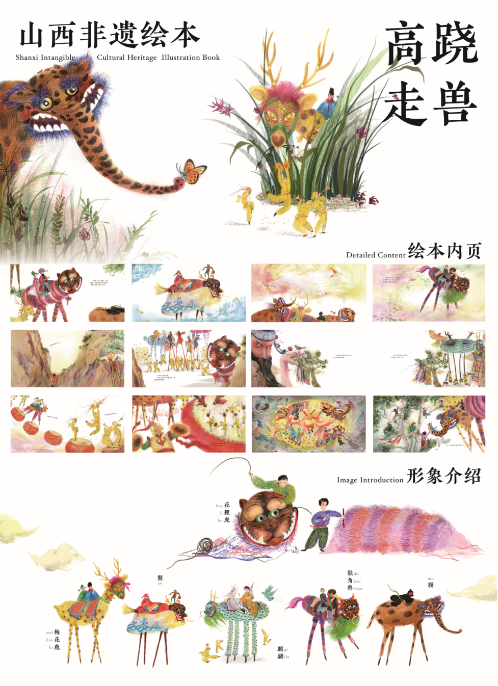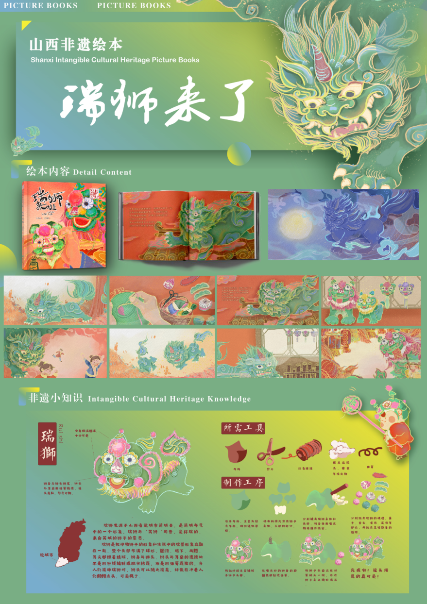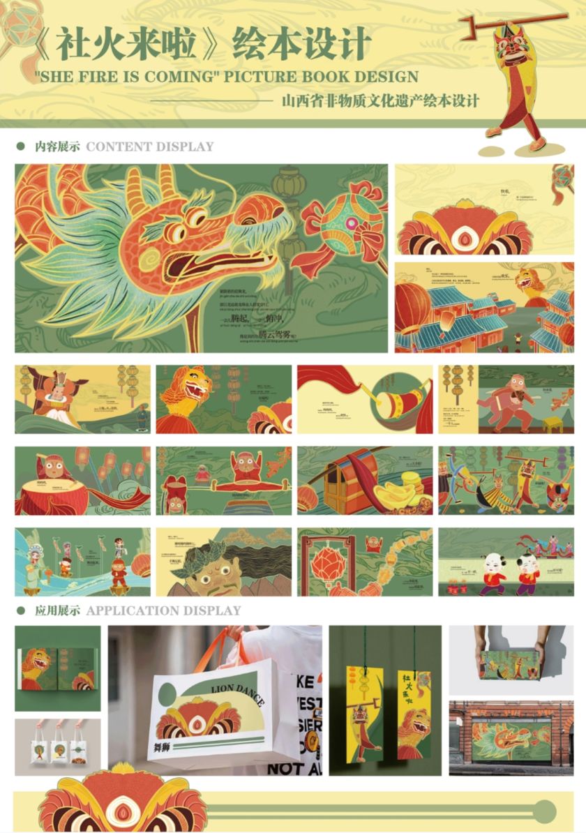 “每多一本原创绘本被出版,就多一份山西非遗的审美浸润人心。”太原理工大学艺术学院范伟教授表示,山西非遗绘本用一个个故事贯穿前后,人们可以从篇幅不长的故事和设计精美的画面中,以轻松有趣的方式感受山西非遗项目的魅力。欣喜的是,在展的诸多绘本设计图稿已经做成成品,甚至出版发行,其中,山西非物质文化遗产绘本丛书《社火来啦》《奶奶的花馍》《高跷走兽》《外婆的布老虎》《瑞狮来了》等已由希望出版社出版,广受业内好评。