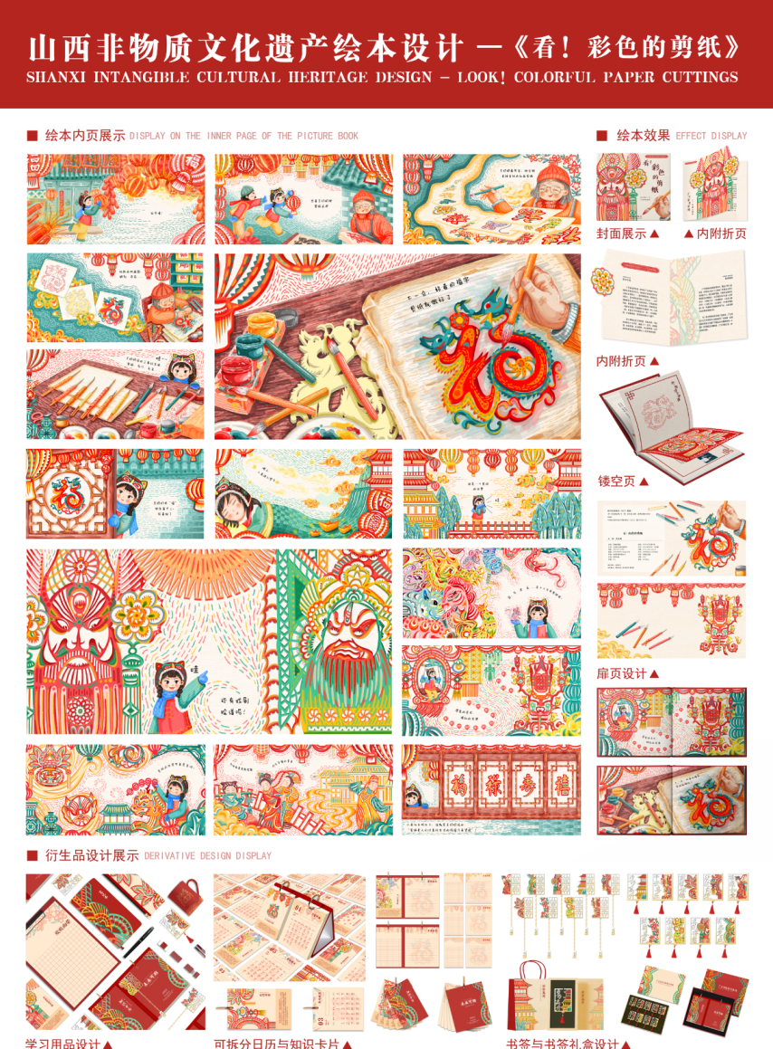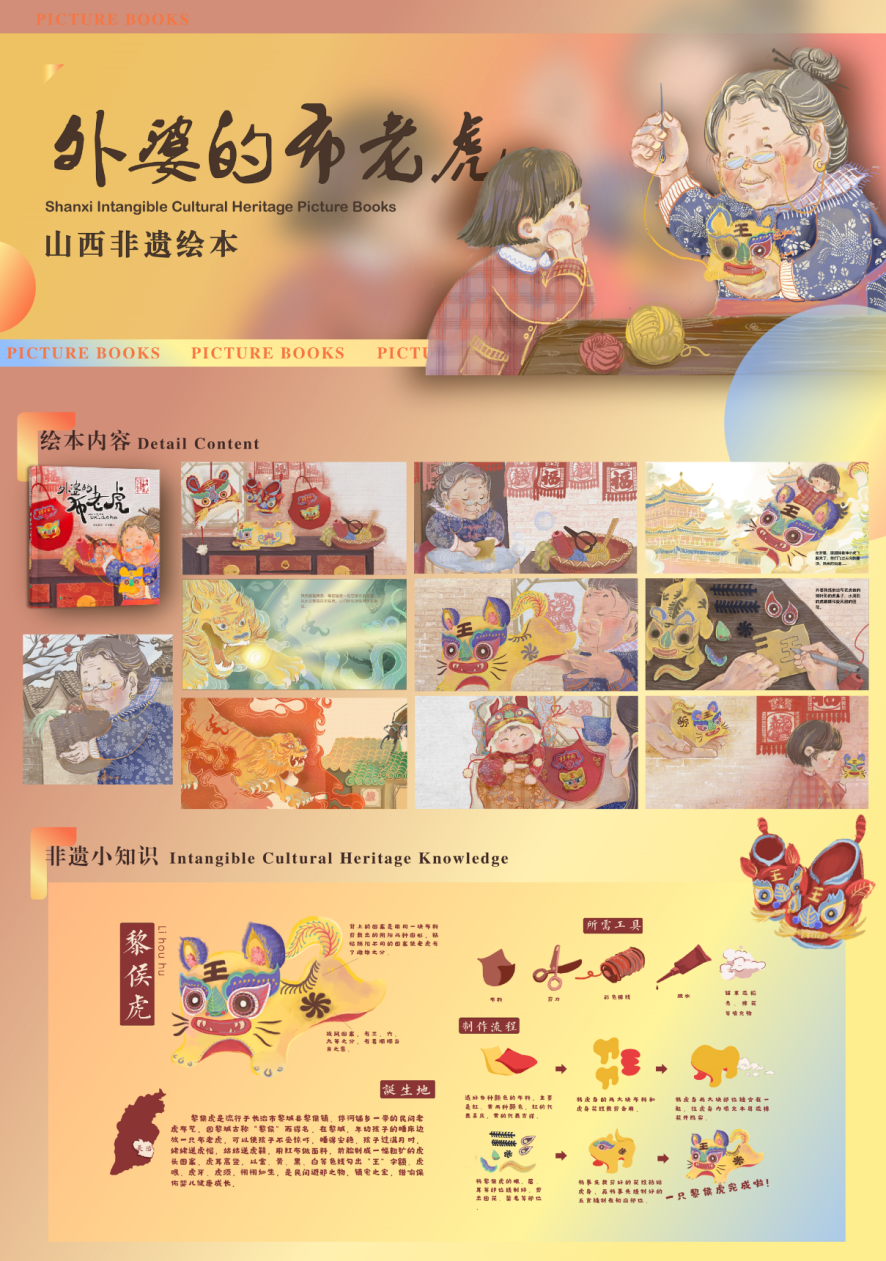 王竹林《外婆布老虎》指导教师:刘东霞是一本儿童非遗绘本,由太原理工大学艺术学院刘东霞教授团队设计,为山西非物质文化遗产绘本丛书之一,荣获2023年度中国“最美的书”。此书弥补了山西本土非遗原创绘本空白。