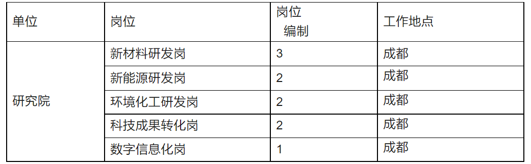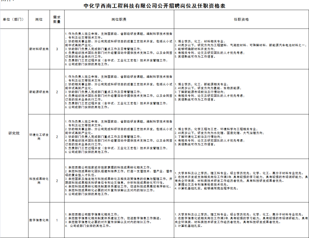 中国化学工程集团有限公司(简称“中国化学”)是国务院国资委监管的大型中央企业集团,是我国化工领域资质最齐全、功能最完备、业务链最完整、知识技术密集的国际工程公司,是石油和化学工业工程领域的国家队,是带动中国技术、中国标准和中国装备“走出去”,高质量共建“一带一路”的排头兵,在油气服务领域稳居全球第一。中化学西南工程科技有限公司是中国化学工程集团有限公司的全资子公司,成立于2022年3月,注册资本3亿元,位于四川成都,现有建筑工程施工总承包一级、市政工程施工总承包一级、工程设计环境工程专项乙级、环保工程专业承包二级等资质。公司紧跟集团“两商”定位,坚持基础设施差异化、环境治理专业化、实业业务多元化、数字化产业智慧化的发展思路,整合各板块上下游资源,推动各板块交互融合,扎根西南、辐射全国,加快将西南公司打造成为集研发、投资、建造、运营一体化的具有行业竞争力的科技型工程公司。根据公司发展需求,采用面向社会公开招聘形式,对公司研究院相关岗位实施公开招聘。具体事宜公告如下: