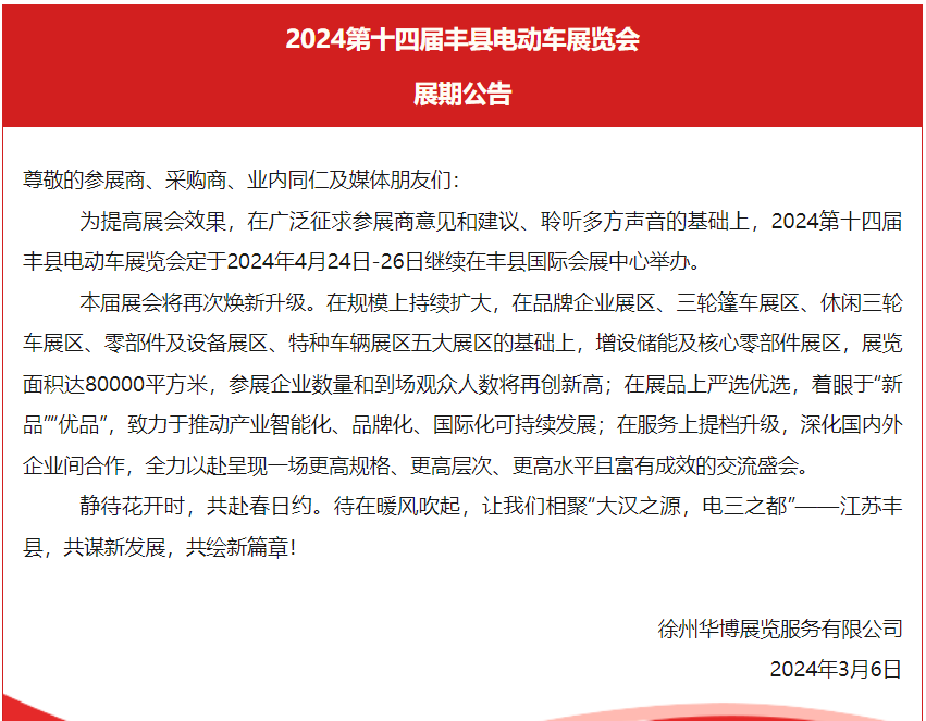 据《三轮车品牌网》了解,丰县第14届电动车展会将暂定于4月24日到26日召开,具体内容如下。
