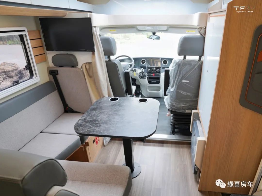 会客区L型沙发+单人便携式座椅组合,可容纳更多人数,沙发座设安全带,方便行车时载人,整车核载5人。中部四向滑移气动升降式餐桌,驻车后可与沙发拼成1400*1200mm沙发床,孩童使用绰绰有余。