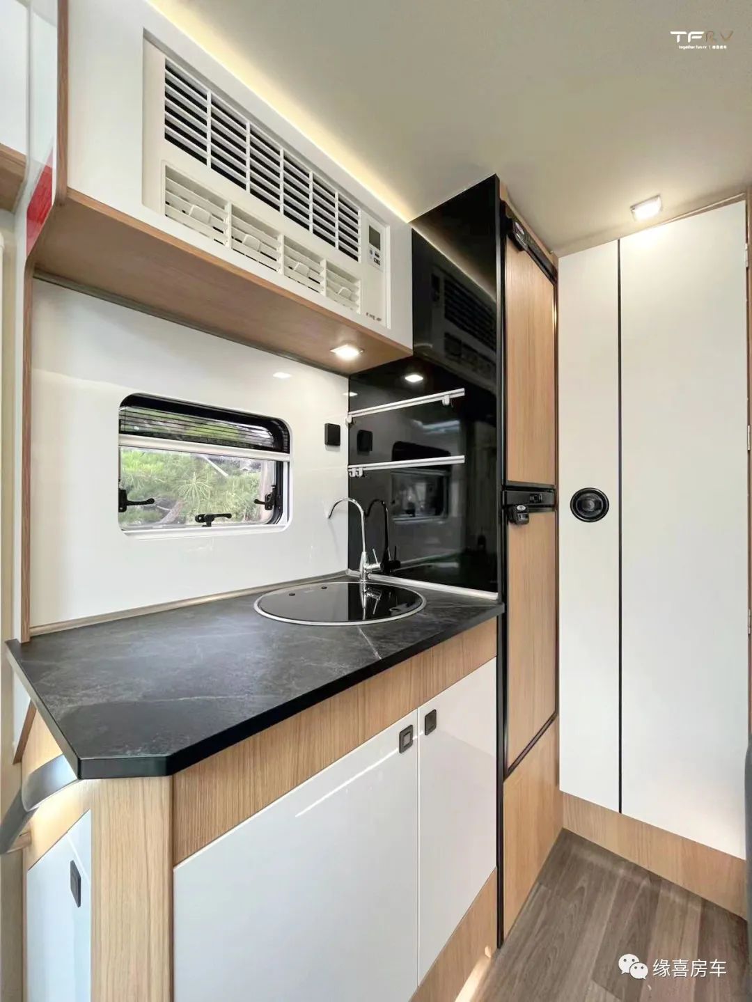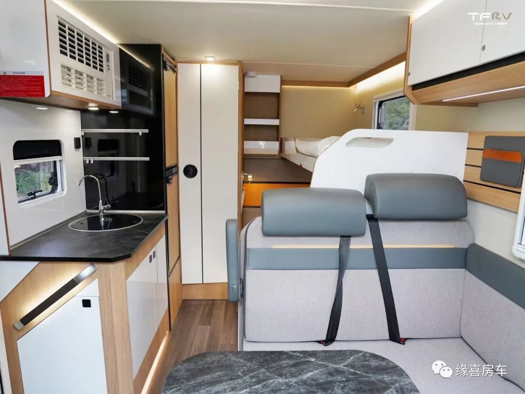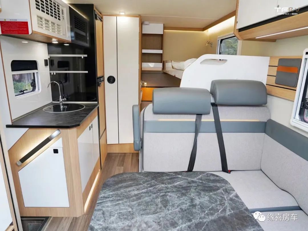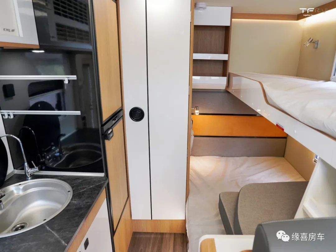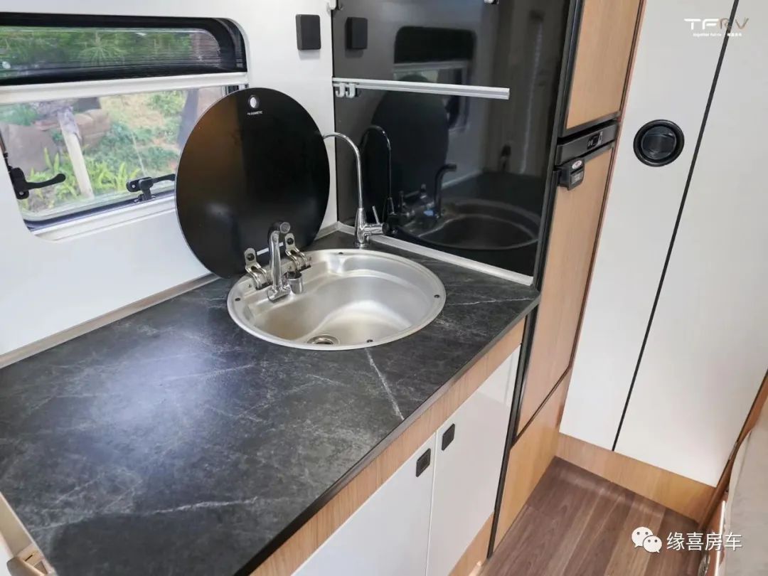 中门右手处为车内厨房区,采用一体式橱柜设计,台面配置进口带盖水盆、折叠水龙头、饮用水装置,充分满足乘员日常烹饪需求。