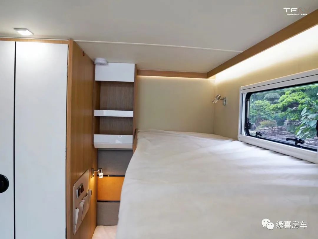 1900*1100mm,空间上基本可满足2-3人睡眠。下床高度仅0.43m,老人孩子起居更方便。床头处设阅读灯,并使用软包包覆,睡眠舒适度进一步提升。侧方外推窗,保证区域内通风、采光,驻车后用于日常观景也是不错的选择。