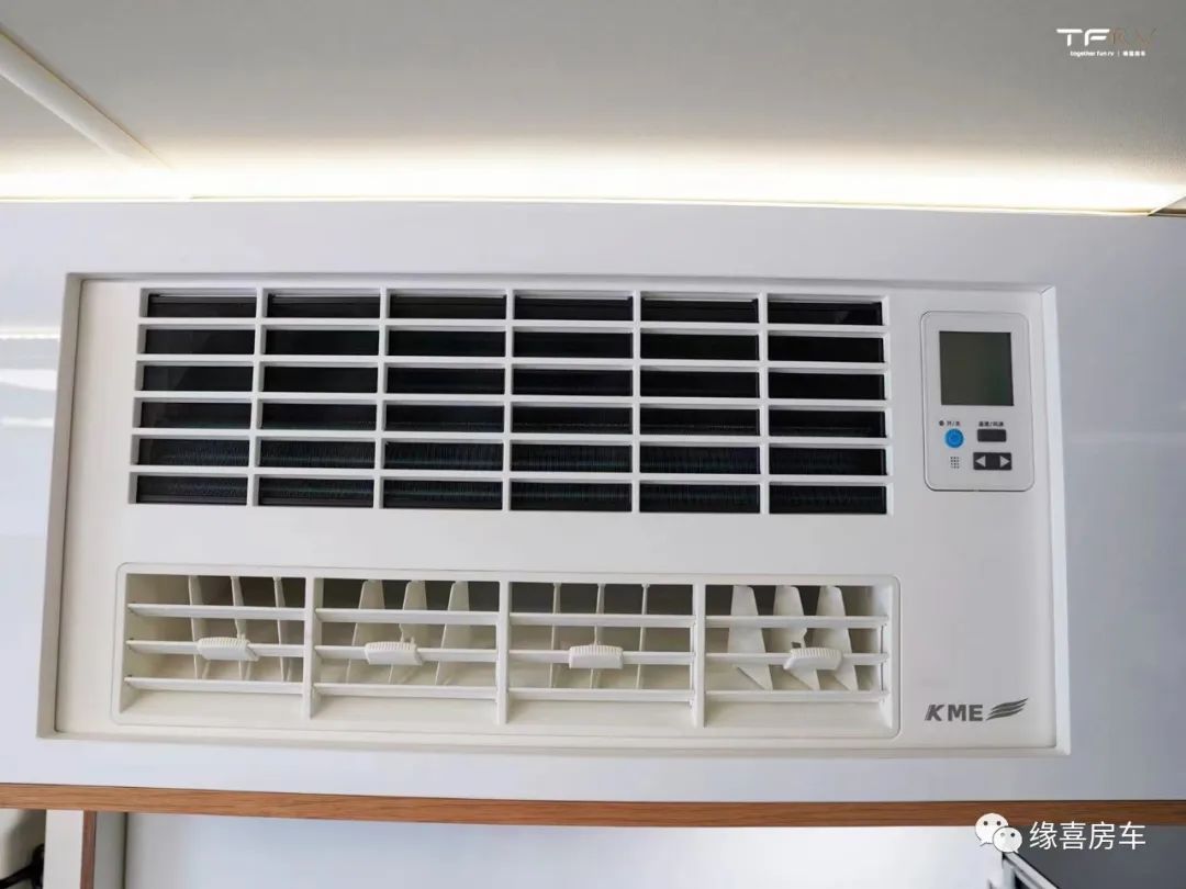 橱柜顶部是12V行驻车两用底置分体空调,整体耗电量非常小,不需要逆变器,打开电源就能实现出风。