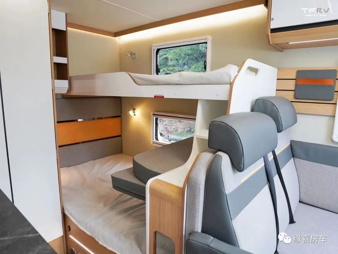 休息区位于车厢尾部,采用后纵置子母床布局,上床尺寸 1900*750mm,下床尺寸