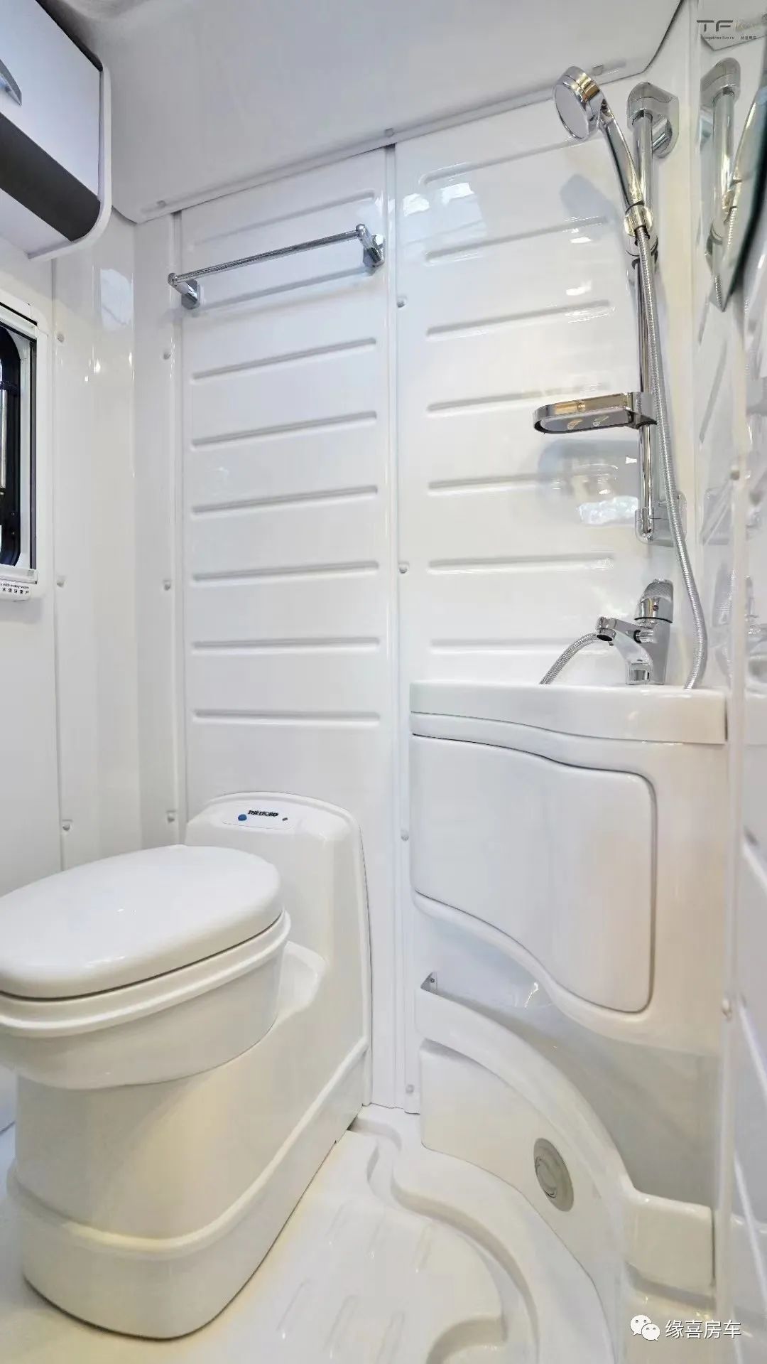 干湿一体式独立卫生间,采用更为环保的ABS吸塑工艺,防水防霉,内部集成有集便式马桶、全套淋浴装置、双向换气扇、洗手盆、储物吊柜、浴室镜、10KW暖风热水系统等,可充分满足旅行时的卫浴洗漱需求。