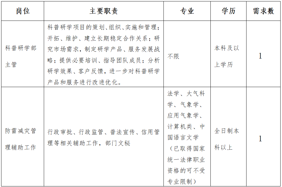 厦门市祥云科技服务有限公司为厦门市气象服务中心全资控股公司,因工作需要,现招聘科普研学部主管1名,防雷减灾管理辅助工作人员1名。现将有关事项公告如下: