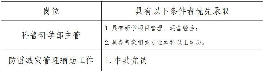 6.科普研学部主管年龄在25周岁以上,45周岁以下(1979 年2月26日至1999年2月26期间出生);防雷减灾管理辅助工作人员年龄在18周岁以上,35周岁以下(1989年2月26日至2006年2月26日期间出生)。