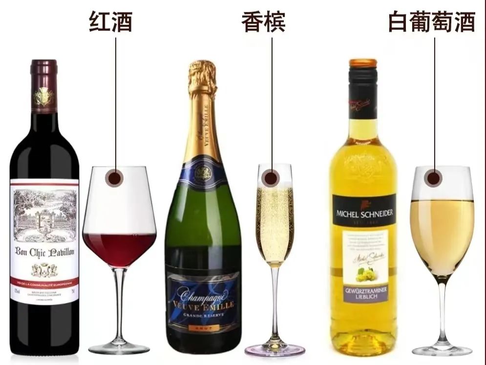 红葡萄酒倒满杯子的1/3,白葡萄酒倒满杯子的1/2,起泡酒(香槟)倒满杯子的3/4