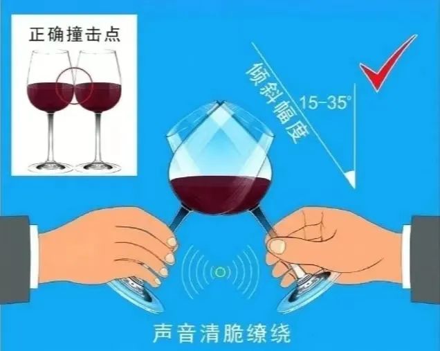 碰杯时,要用杯肚,不能用杯口杯沿,双方都有大约15-35°的倾斜;切忌用力过猛,动作尽量轻柔,点到为止