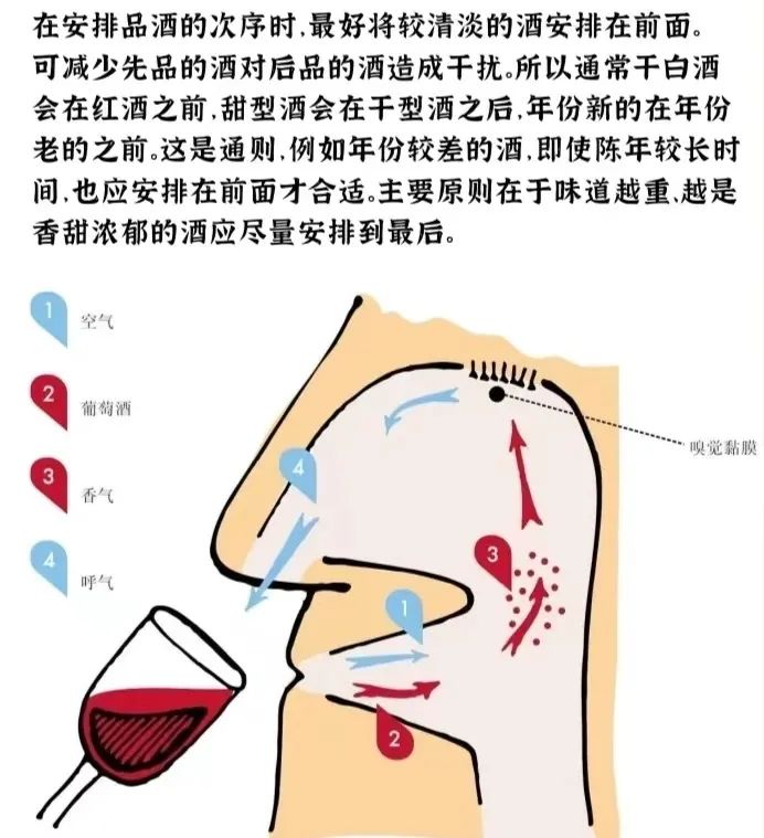 喝酒时,先把杯口靠到鼻子处,闻其香气,再嘬一小口,让葡萄酒充满口腔,然后再慢慢吞咽,用整个口腔感受葡萄酒的美妙味道,切忌一饮而尽