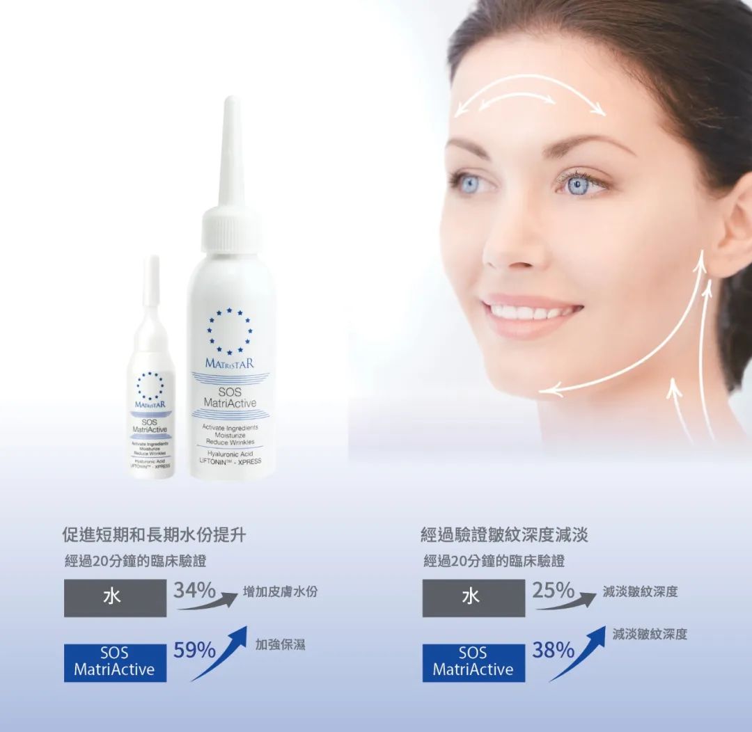 SOS活肤精华露,蕴含透明质酸及LIFTONIN丘-XPRESS (对抗肌肤衰老的活性成分复合物), 是一种纯度高的活化精华。