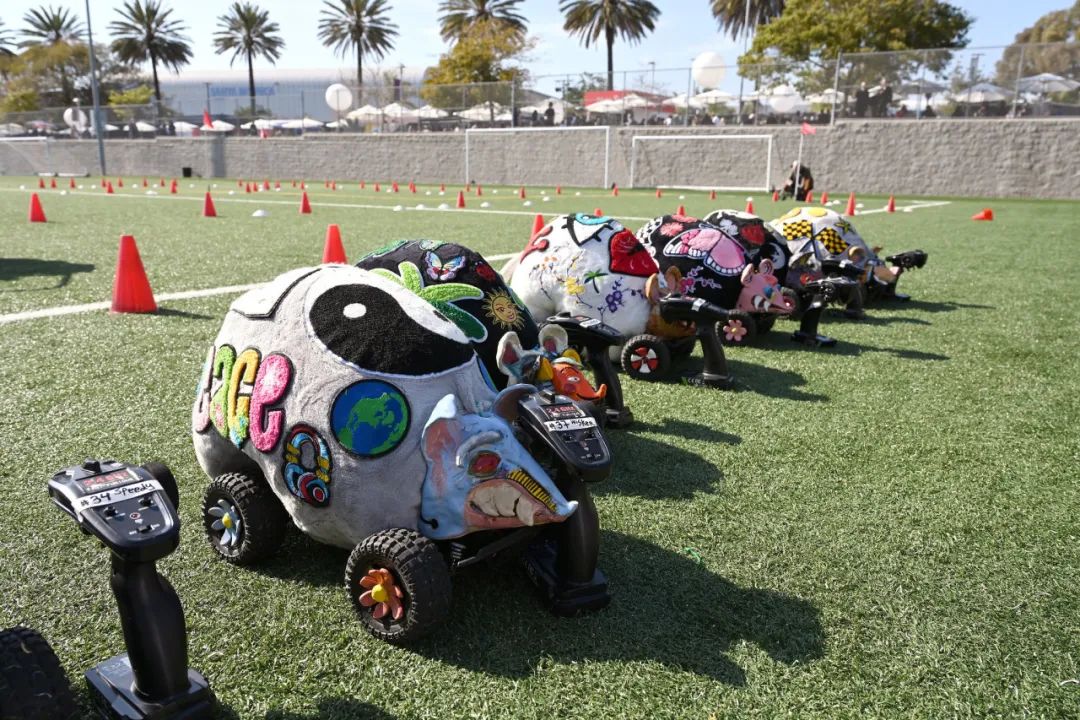 展会上最不走寻常路的作品之一是谢里夫·法拉格(Sharif Farrag)的行为作品《老鼠赛跑》(Rat Race,2024),遥控车载着陶制老鼠,在博览会外的人工草坪足球场的赛道上展开竞速。