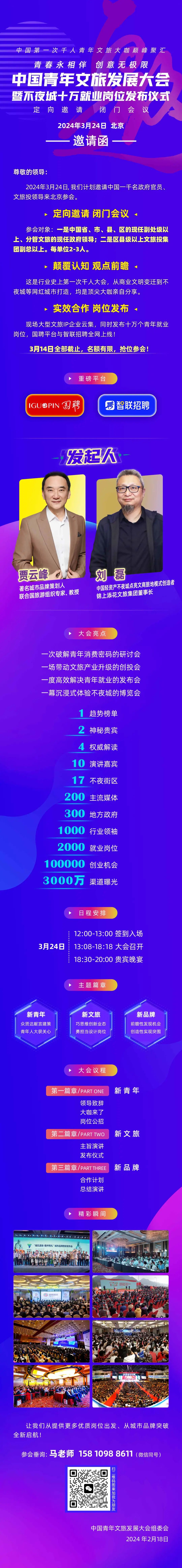 青年创造品牌,文旅拉动就业。3月24日,由联合国旅游组织专家贾云峰教授与中国轻资产不夜城点亮文商旅地模式创造者、锦上添花集团董事长刘磊先生共同倡导,中国首次千人青年文旅大咖盛会“中国青年文旅发展大会暨不夜城十万就业岗位发布仪式”将在北京举办,规模空前、亮点频出。