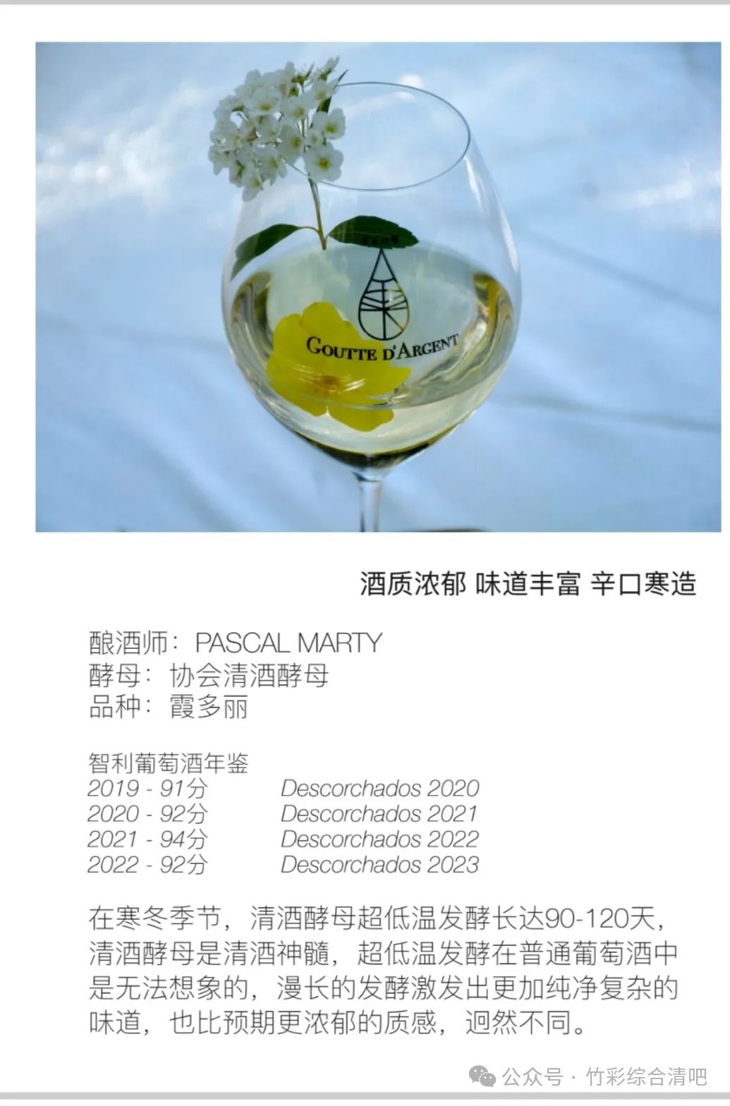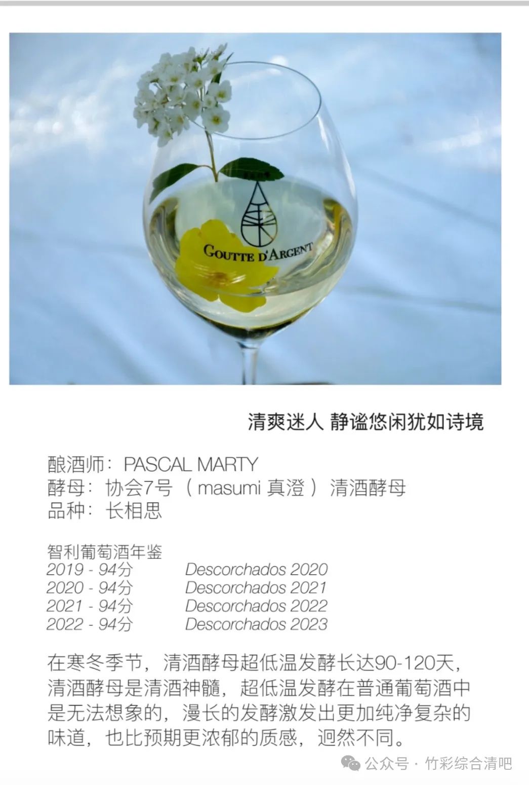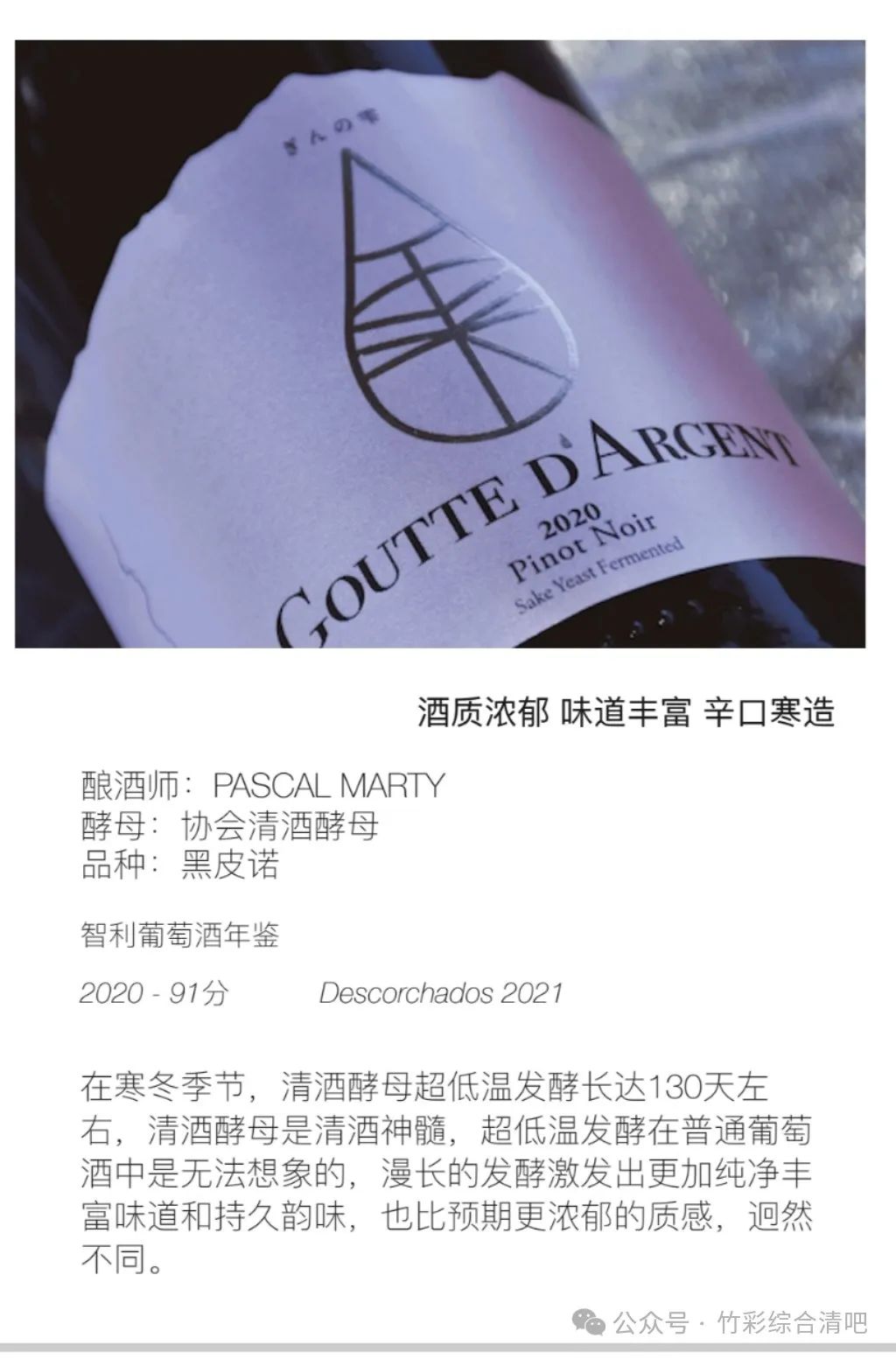 雾吟 水滴 GOUTTE D'ARGENT灵感源自世界著名酿酒大师PascalMarty先生多年来的构想,以及“獭祭”创始人樱井博志先生,“神の雫”原作者亚树直支持,2018年“ぎんの雫”Goutte d'Argent 一款全新的清酒酵母发酵(寒造)的长相思“开辟新天地”,她的名字“雾吟水滴”,静谧悠闲犹如诗境。