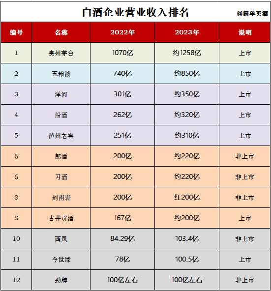 1、这个榜单里,大部分都是第一部分里出现的全国名酒;3、而十七大名酒中的董酒、全兴、黄鹤楼、武陵酒、宝丰酒、宋河、沱牌,则没有出现在榜单中;4、剑南春、习酒、郎酒,三家未上市的公司,准确数据无从统计,习酒和郎酒的数据应该比剑南春要实一些,而剑南春过200亿,也算是行业公认的吧。5、劲牌是唯一的另类,以露酒和草本白酒为主,有劲牌和毛铺两大品牌。