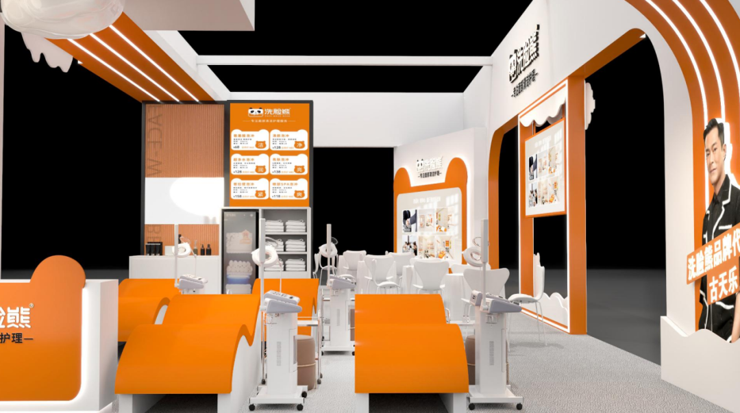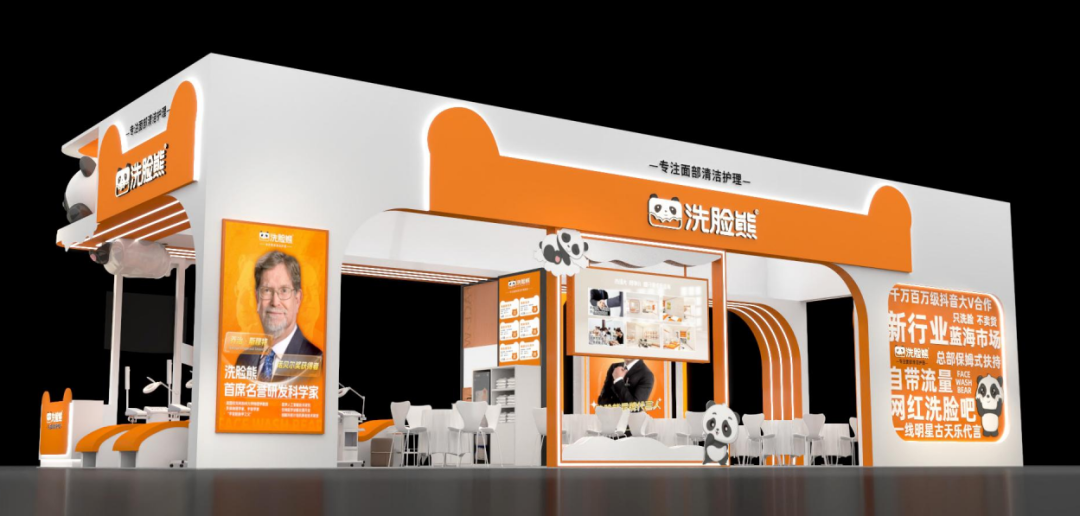 莅临美博会现场,洗脸熊展馆会让你眼前一亮。全新升级门店,以年轻、活力、可爱的形象震撼来袭!展馆设计以橙白色混搭为主,还有代言人古天乐和首席名誉研发科学家乔治·斯穆特的形象助阵,整体的塑造高端、大气,时尚感满满,里面还设有洽谈区、洗脸区和互动区等多个区域,欢迎各位创业人、美业人前来咨询了解。
