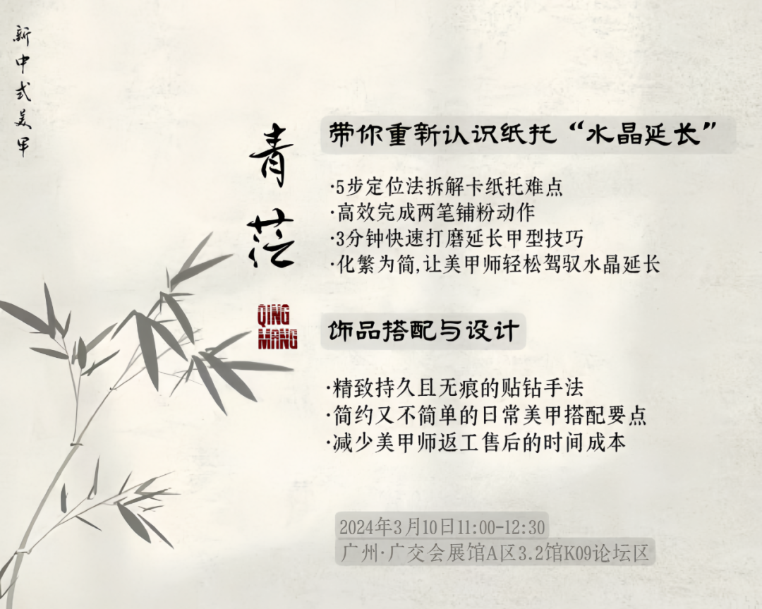 国际美甲美睫时尚舞台此次更是迎来了6位美甲美睫大咖讲师,青茫@紫薇老师、东其美业@叶东其老师、洛爵丝@贝拉老师、小双美业@小雙老师、U3美甲@北村亮、Bella老师将轮番带来门店升单必备美甲美睫真人技术演示,三天精彩详情马上奉上!本届穿戴甲集市围绕核心关键词「不止零售」,吸引了新一批超三十多家穿戴美甲美睫上下游企业入驻,除了紧跟穿戴甲赛道潮流热点,向大家展示最新最热的穿戴甲、穿戴美睫、美甲贴纸饰品等产品以外,与其相关的新技术、新应用、新解决方案、甚至新商业模式也即将在现场发布,展现行业最前沿的创新趋势!作为本届集市的指定合作单位,广州洛爵丝化妆品有限公司在现场特设了L’UGX品牌专柜,大家可在现场体验全新一代的防水打磨机、强力涡轮吸尘器、二合一大功率美甲灯等深受美甲爱好者喜爱的产品。这不仅是一个了解最新美甲趋势的绝佳机会,也是一个将L’UGX新品带回家的好时机!植萃护手指缘油 C'est Iris 鸢由品牌方——广州女为己容电子商务有限公司AiMTnails 美甲饰品——烟台华涛商贸有限公司JFSHOW睫妃秀 睫毛工厂——广州欧尔佳贸易有限公司Beauty cc choice——广州市为食帮网络科技咨询有限公司MISS MIIME 穿戴甲——玉环市圣金自动化科技有限公司Muse•um 灵感 穿戴甲——深圳斐颂信息技术有限公司自2016年起,青茫美甲就以其独特的创意和精湛的技术,成为美甲行业的璀璨明星,并以独特的“青茫风”受到广大消费者的喜爱。从第一家实体门店的开业,到2019年成立青茫体系教学培训中心,青茫始终走在行业的前沿,引领美甲潮流。青茫延长体系汇集了教学老师10年的美甲实战经验,将学习延长过程化繁为简,让美甲师快速高效地掌握纸托延长技能,真正落地到美甲沙龙店。在青茫综合延长体系中,学延长最大的收获并不是这个甲型修的好不好看,而是提升美甲师的核心价值,得到客户的尊重,把真正有价值的技术传递给客户,提高行业门槛,共同创造良好的行业氛围。