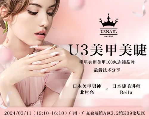 本次活动由东其美睫匠心美睫创始人东其老师现场真人实操展示15分钟快速嫁接技法,60天牢固王锁扣技术,深度剖析快速嫁接的原理技法实用性,解决美睫师牢固度难题,牢固度可达60天,更贴近实战的教学,从根源解决嫁接速度慢的问题,让每一个美睫师提升掌握技法。广州洛爵丝化妆品有限公司作为行业内领先的综合性专业美甲企业,始终坚持以“诚信为本质量第一”为核心,以“服务客户,共同发展,互利互赢”为理念,共同致力于将“L'UGX”打造为中国美甲第一品牌,以及世界美甲知名品牌。L'UGX品牌源自中国,LUX象征着奢华,G代表魅力、注重时尚和简约,是有着轻奢韵味的品牌,给予爱美人士不只是色彩的享受,还有魅力的传达。洛爵丝(L'UGX)携手贝拉(Bella)老师为您带来一场精彩的客甲快速延长现场示范,从美甲前置处理到浅贴光疗延长的全过程,作为全网50万粉丝的美甲博主,贝拉老师不仅是贝拉美甲培训创始人,还是拥有12年实战经验资深美甲师,她将分享多年的实战经验,教授不伤手的卸甲方式以及实操快速手法,从根源解决美甲师持久度以及速度的问题,提升美甲师技术和审美,从而拥有自己的核心竞争力。洛爵丝和贝拉老师一直秉持着相同的理念,致力于提升美甲行业的标准和水平。我们相信,通过这场活动,您将获得更多的技巧和灵感,进一步提升您在美甲行业的能力和地位。小雙原创中式美睫品牌创立于2021年,是一家专注于中式美睫技术研发,培育一体的新生美睫技术公司,中华全国工商业联合会美容化妆品业商会美眼美睫专业委员会常务副主任单位。小雙原创现代中式翘睫技术理念,原创INS风、漫画款、穿插款等上百种美睫款式设计,已培育上万名美睫学员,持续让中式美睫技术迁移全球、引领中式国潮。“小雙”秉承着感恩之心来到美博会与所有美业行业人士交流学习,期望在此将中式美睫技术进一步传向美睫爱好者。“小雙”中式美睫致力于美睫技术研发与美睫产品的创新、交流与推广,高标准、重创新,顾客口碑至上是“小雙”的发展理念,创始人“小雙”为持续创新美睫手法技术,不断改进、研发现有的美睫理念、款式,审美、探索顾客需求,当前已发展并形成了行业内独树一帜的中式美睫技术,深受客户与行业好评。“小雙”以打造中式美睫第一品牌为发展愿景,让全球的用户借此了解富有东方韵味的中式美睫!本次活动由东其美睫匠心美睫美创始人东其老师发布2024最新流行技术,解锁美睫新定义,现场进行真人实操展示,各种流行款式分解,疑难眼型搭配现场交流,单双镊现场演示,看的不仅是美睫技术,还有认知的高度和审美的高度。U3美甲100店连锁-明星御用美甲品牌-分享最新美甲美睫技术U3美甲——明星御用美甲品牌, 2012年成立于日本东京,历经十年,U3线下拥有100+美甲美睫沙龙连锁店,6所JNA认定考点美甲美睫培训学院,中日总部两个美甲美睫产品公司。U3的服务理念是用最好的技术,做好服务,最好的审美,为每一位客人打造量身定制的美甲美睫设计方案,彰显每一位客人的个性化的魅力。3月11日,U3将携最新产品、专业课程、加盟政策,以极大优惠力度登陆广州美博会,同时发布2024年美甲美睫流行趋势及专业美甲美睫技法,现场演绎“日式指上繁华、睫上魅力”!U3美甲本次为大家请到了日本美甲大师——北村亮亲临现场,演示2024春夏美甲款式最新技术,还邀请到日本睫毛认定讲师Bella老师亲自演示最新睫毛款式嫁接方法!