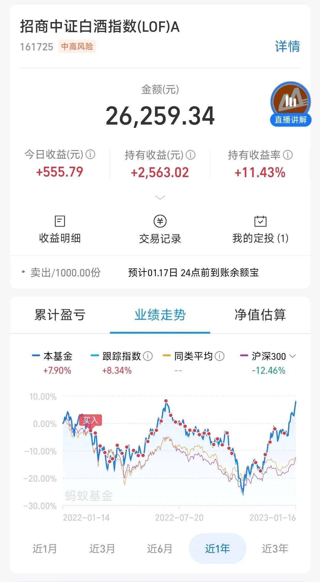 今天白酒又是两个多点的涨幅,我的收益已经超过10个点,根据之前定下的规矩,我要卖出一比,不会再贪了,及时落袋为安,到手的才是自己的