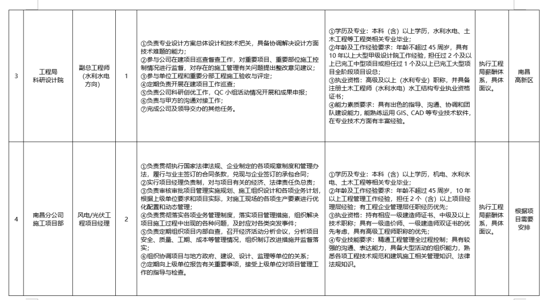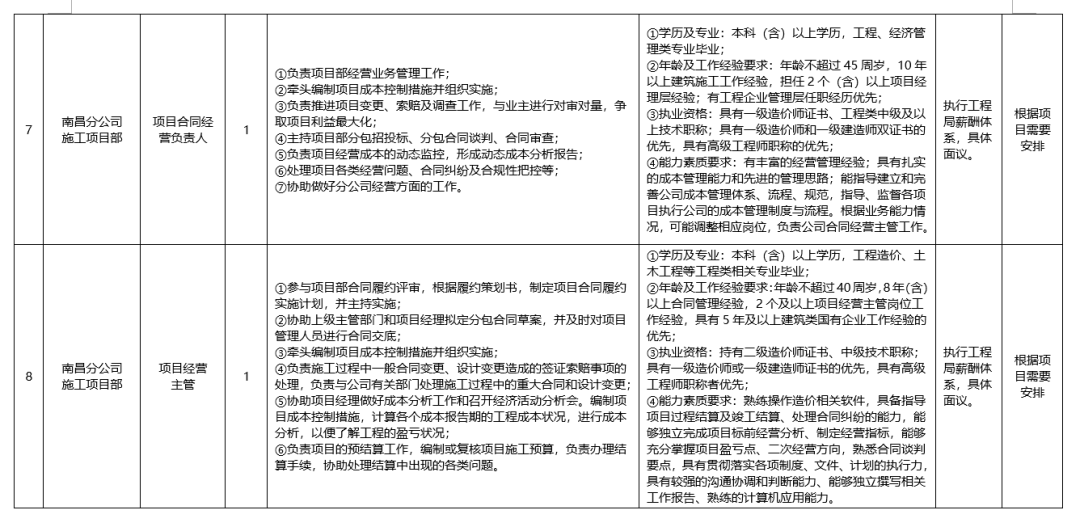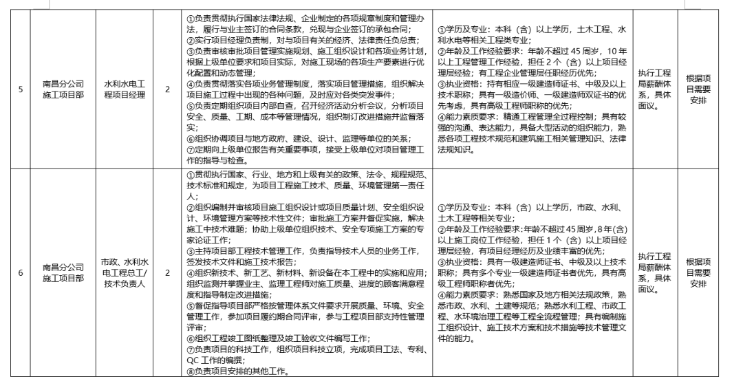 (三)南昌分公司机电工程项目经理2人、水利水电工程项目经理2人、水利水电工程总工/技术负责人2人、项目合同经营负责人1人、项目经营主管1人