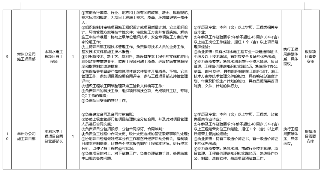 (四)常州分公司水利水电工程项目总工程师1人、水利水电工程项目合同经营部部长1人