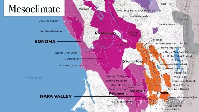 如果你再对大气候作进一步的研究,你还会发现在同一地区里面的的不同的葡萄园所出产的葡萄酒也有细微差别。中气候指的是在同一特定区域里面的不同气候。比如说,由于距离河流的远近不同形成的气候上的差别,在河流附近的地方气温可能低一些,而且早上雾气比较重;在距离河流远一些的地方就有所不同。再比如在山坡上位置的高低不同的位置上的葡萄园,她们所处的气候条件也不一样。中气候的影响也是纳帕谷被分成16个子产区的原因之一。