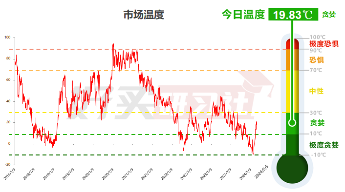 今天(2024/3/7)市场温度为19.83 ℃,随着近期市场迅猛反弹,市场温度明显回升,但依然处于贪婪区间,仓位不足的可以考虑继续补仓。考虑到市场信心仍有些不足,建议始终给自己留有一些余地应对可能的更极端的情况。