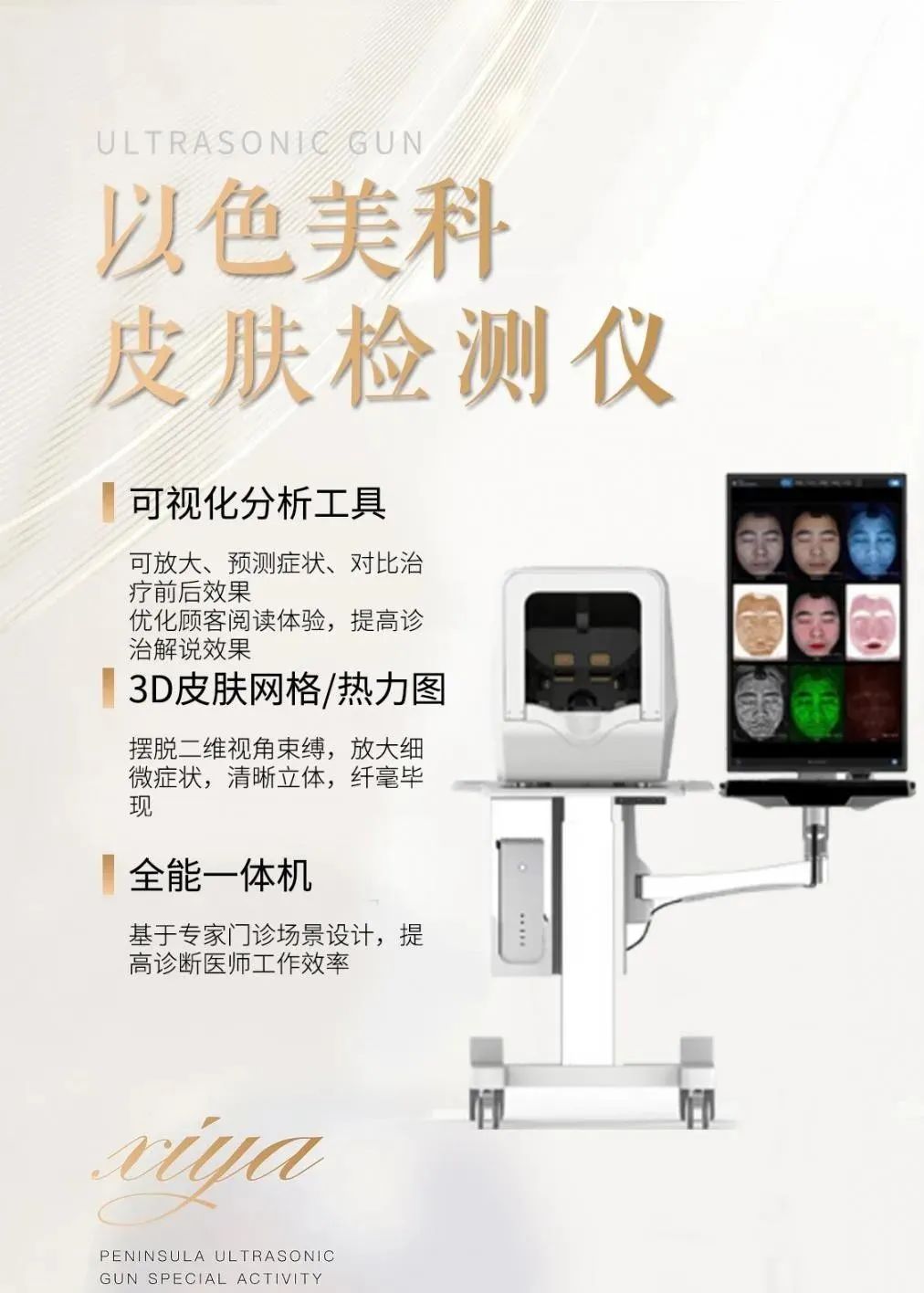 设备属性:皮肤专业诊断 全脸3D检测深层模拟18-80岁皮肤年龄变化高清呈像 智能分析自动识别皮肤表层深层问题
