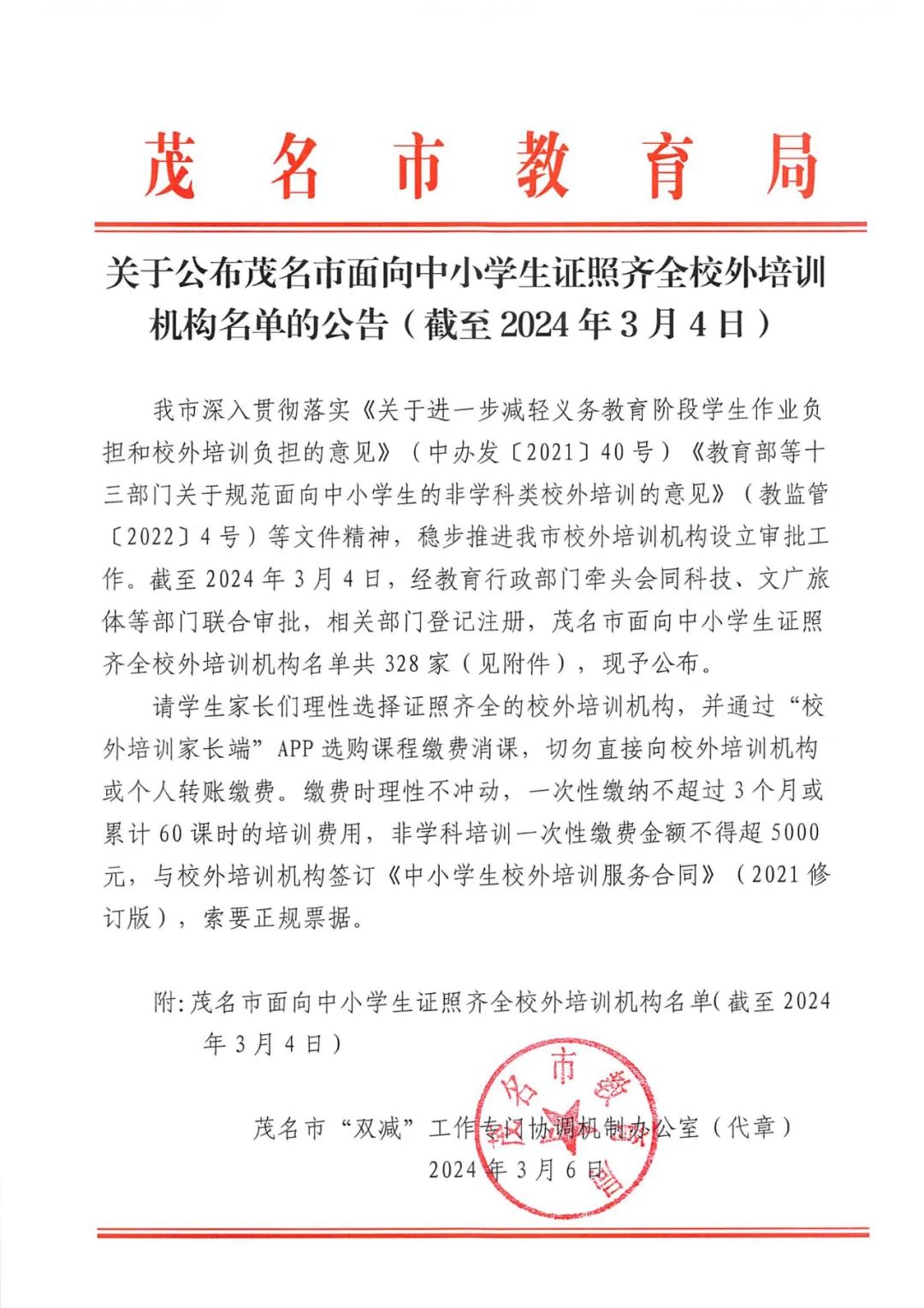 | 茂南区面向中小学生证照齐全校外教育培训机构名单 | ||||||