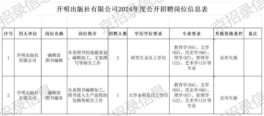 此次招聘为图书编辑岗位、计划招聘2人,图书编务岗位、计划招聘1人。具体岗位及资格条件详见《开明出版社有限公司2024年度公开招聘岗位信息表》。其中,有关岗位专业条件参考教育部公布的专业目录(《普通高等学校本科专业目录》和《授予博士、硕士学位和培养研究生的学科、专业目录》)。报名应聘人员在报名时对专业有任何疑问的,可以直接拨打报名咨询电话进行咨询了解。