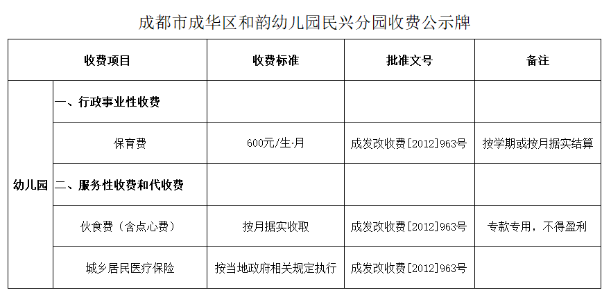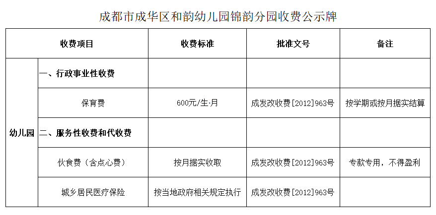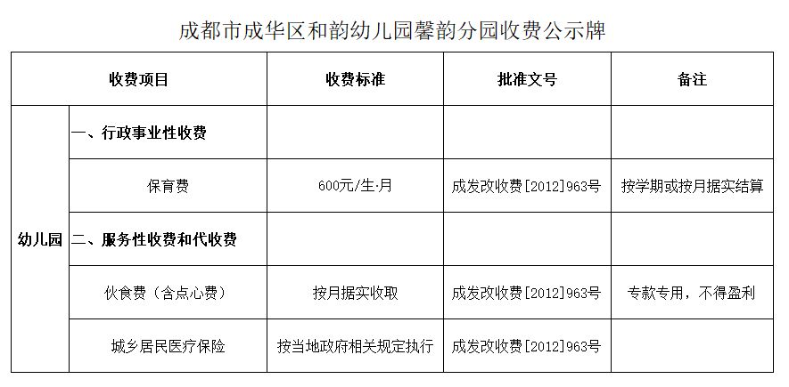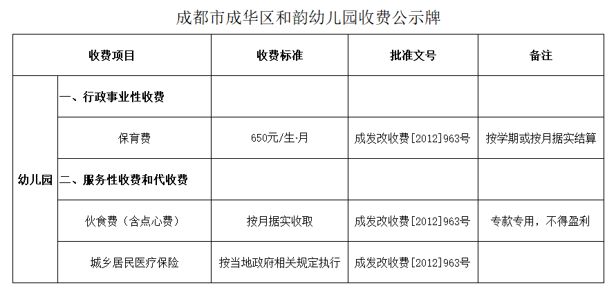 根据省教育厅《关于进一步加强教育收费管理有关事项的通知》要求,现将成都市成华区和韵幼儿园收费信息公示如下: