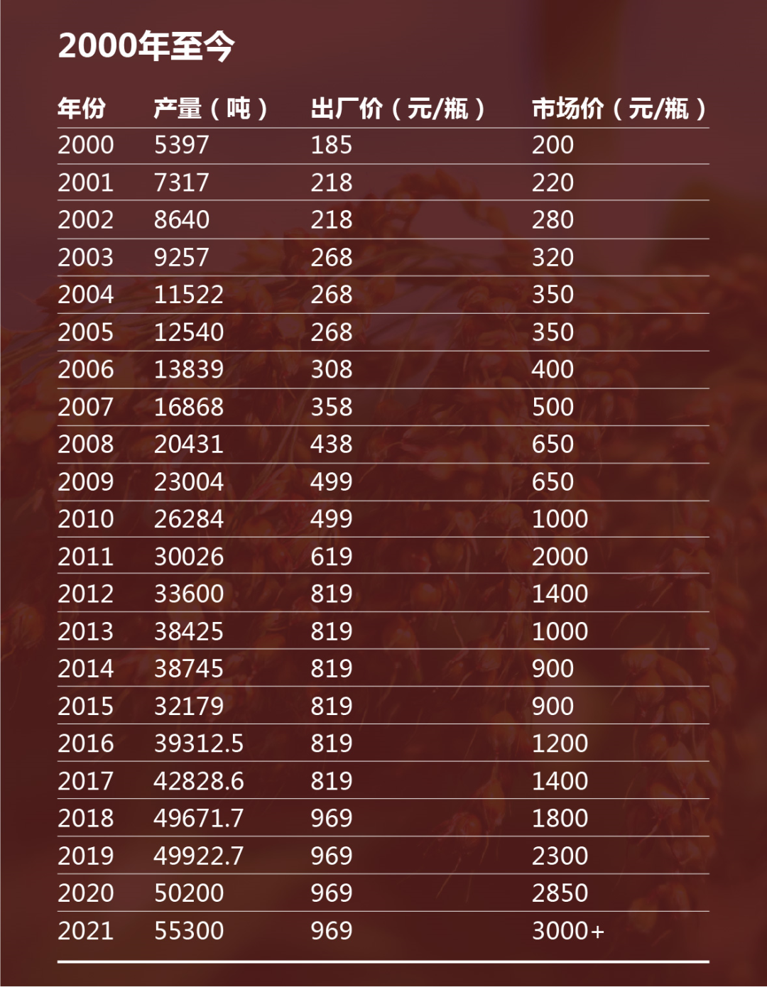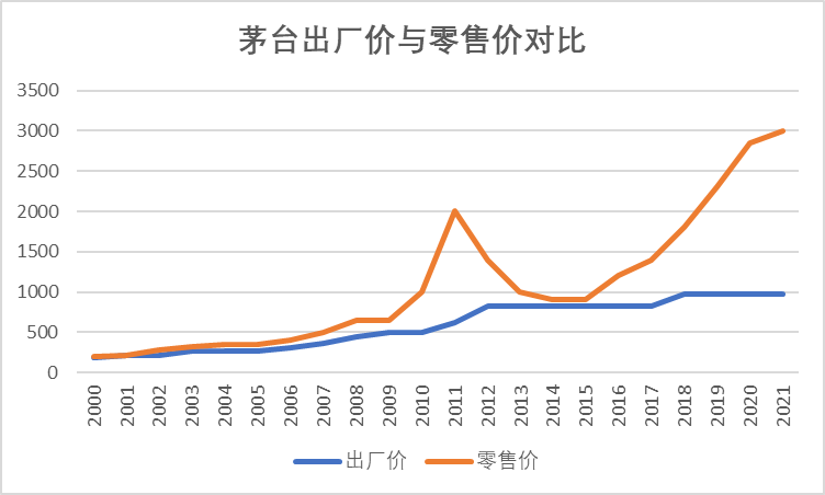大家还记不记得2013、14年白酒业的惨状,到今天也不过10年左右,行业是如何从一片萧瑟变成了烈火烹油的呢。当年,对白酒影响最大的是塑化剂风波和限制三公消费,而且2012年-2013年也正值白酒库存周期高点,经销商大量囤积销售不出去,导致价格倒挂现象十分严重。经销商囤积白酒也是有原因的,2013年前,白酒终端零售价与出厂价之间空间巨大。上面2张图是历年茅台出厂价和终端零售价的对比,可以看出明显的周期性。1997年,亚洲金融危机爆发;1998年,朔州假酒案令白酒行业遭受重创;2000年,是白酒行业周期的低点,茅台的出厂价和零售价之间的差距并不大。2003-2013年,是茅台历史上的“黄金十年”:- 2008年,茅台酒营收首次超过五粮液,成为新的“白酒大王”。