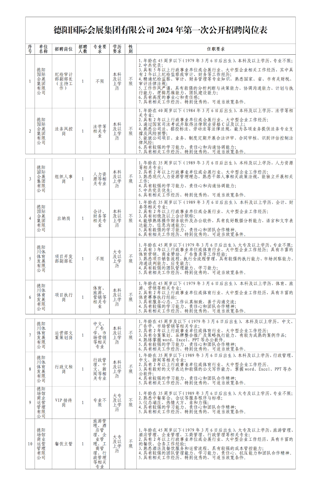 (四)各岗位具体任职要求以《德阳国际会展集团有限公司2024年第一次公开招聘岗位表》为准。