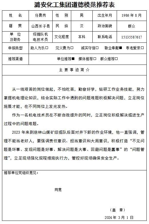 任勇岗,男,1986年8月出生,汉族,现任慈林山煤矿综掘队机电技术员,自2012年参加工作以来他就一直奋战在生产一线,步入矿区作为一名普通清煤工,在工作中一直兢兢业业,即使是领导安排加班加点也毫无怨言,从一名普通职工慢慢地成长为一名技术员,这个过程是艰辛的,但也是值得回忆的。从一线艰苦的岗位做起,2012年步入矿区作为一名普通清煤工,下井第一天,现场的工作环境就给他上了深深的一课。面对工作面隆隆的机械声搅得他心慌意乱,飞扬的粉尘让他无处藏身,闷鼻的防尘口罩使他上气不接下气......。面对这些,他没有多想。他知道“干煤矿,是一个艰苦的工作,既然来了,就要做好。”他工作中不怕吃苦,有什么活儿总抢在先、干在前,有什么不懂的、不会的就虚心向有经验的工人请教学习。由于他对工作缺乏具体的实践经验,许多东西需要从头学起。为此,他利用业余时间查看书籍学习提升,有弄不明白的,就向老工人请教,同时十分珍惜每一次学习的机会,在2013年9月到潞矿二中参加了为期一个月的机电工培训,他仔细听讲认真学习,努力掌握机电理论知识,结合实际工作中遇到的问题难题积极向教学首席技师请教。在此期间通过同学间相互学习讨论积累了大量丰富翔实的经验和图纸资料,为在后续井下实践工作中,夯实了坚强的基础。2015年9月作为一名文化员由综采队调入综掘二队,在日常工作中他注意到了队组6S管理推行中的薄弱环节:6S日常管理上巡查落实不在现场,B卡、C卡填写不及时不规范,日清日结未落实。他着眼于细处,努力做好本职工作把好第一关,从落实岗前仪式记录开始,坚持参加三班岗前仪式,精雕细琢一点点改变现状,经过将近一年的付出和努力,在矿文化办和队长、书记督促辅导下,我队终于在2016年八月份正式挂牌“6S达标点”,并于2018年上转为“6S示范点”,为综掘二队赢得了荣誉。2021年担任机电技术员后他在业余时间不断为自己“充电”,在学中干、干中学,缺什么,补什么。为了更加系统地学习掌握机电检修专业理论,他白天到井下现场实际了解机组的工作性能。晚上,结合机组图纸和实际对照,对每一台设备的运行状态和维修情况都细心的作好记录,对工作中机电设备出现的故障部位、原因、部件及处理方法进行总结记录,并进行相关原理分析等,并整理成册组织本队机电工共同学习提升。用技术带动安全生产,为了树立员工积极进取的主人翁意识,3118运巷生产掘进过程,由于运输战线长,皮带跑偏问题一直困扰我队,影响每日生产任务完成,他积极到现场进行原因查找,发现皮带机卸载臂活动空间过大,还有游动小车和架带小车左右移动空间过大,导致皮带机储带内跑偏,他亲自在现场指导检修人员皮带跑偏调辊方法,同时督促防跑偏装置的安装落实,及时排除了这一故障,保证每班安全生产工作顺利进行。用行动守护安全,为员工树立爱岗敬业的责任感,记得有一次,综掘机掘进完成以后,在移机过程中,遇到了难题,面对底板松软,先下坡,坡底有积水,最后拐弯90°角上坡,短短50米的距离,综掘机陷在低洼处不能动弹,面对窘境,积极与班组长研究方法,同时给职工做思想工作,克服职工连续疲劳作业带来的负面情绪,通过使用150根道木,30根大板梁铺底,供综掘机在上面行走,最终,成功移机至指定位置。他日常工作中积极参加班前会且不定期地组织员工学习岗位技能知识,以及各项规章制度,让职工们都能充分认识到“安全责任重于泰山”,每年组织设备操作人员及检修人员进行业务培训,指导设备操作人员及检修人员的业务学习,学习型班组活动在实践工作中得以发展,“做学习班组中的学习员工”,成为了他们的口号,充分调动了职工的工作积极性、主动性。同时在综掘二队担任技术员期间,结合本队掘进作业情况积极通过小改小革绘图制作机组电缆随机跑道,实现减人提效。只有爱岗敬业的人,才会在自己的工作岗位上勤勤恳恳、精益求精,才能对自己所从事的事业无悔付出。在2023年来到慈林山煤矿综掘队后一直强调,管理不能当老好人,要强调责任意识、担当意识和大局意识,积极打造“不见问题是坏事、发现问题是好事、解决问题是大事、回避问题是蠢事”的“问题管理”。他倡导执行无理由,不为失败找借口,要为解决实际想办法的良好氛围,他要求,要说一句算一句,句句算数,干一件成一件,件件落实;一级抓一级,级级负责;只有这样,机电管理才能站在保证安全生产起点上,实现新的突破。一次,一个检修工因为井下作业时没有落实标准,造成了设备“失爆”。事后被队里考核了,想找他“求求情”,并表示以后再也不马虎了,他语重心长的说:“如果每个人违反纪律、犯了错误都能通过人情来逃避处理,那对那些认真工作的人是不是就太不公平了?况且考核对大家都是一样的,我是要维护一个人的交情还是要全检修组的公平?”听完这些话,这名员工羞愧地走了。他就是这样一个人,对工作认真负责、一丝不苟。他认为,既然站在了这个岗位工作,就应该以最高的标准干好本职,没有条件就立足现有要创造条件,还要注重学习先进来提升自己,只有不懈的努力,才是一名青年应有的态度。整理/魏晓婧