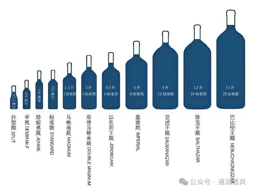 从容量大小来分,又有187ml-375ml-500ml-750ml-1.5l-3l-4.5l-6l-9l-12l-15l等十一个规格,以波尔多瓶型为主。