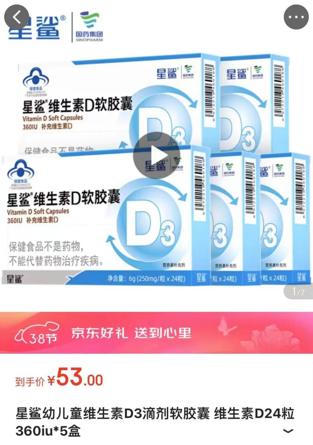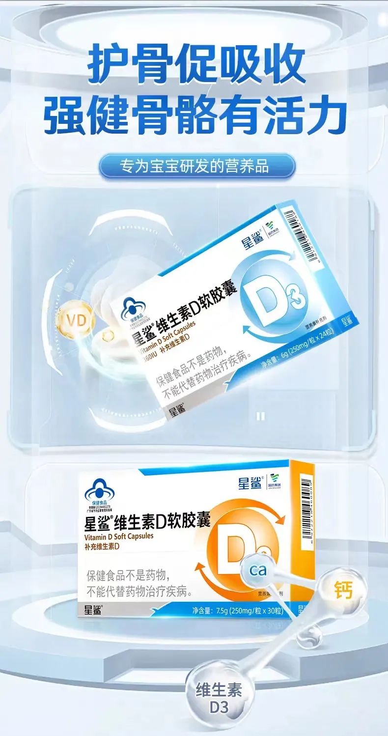 10、星鲨 维D3软胶囊24粒*5盒+赠液体钙60粒,53元180粒