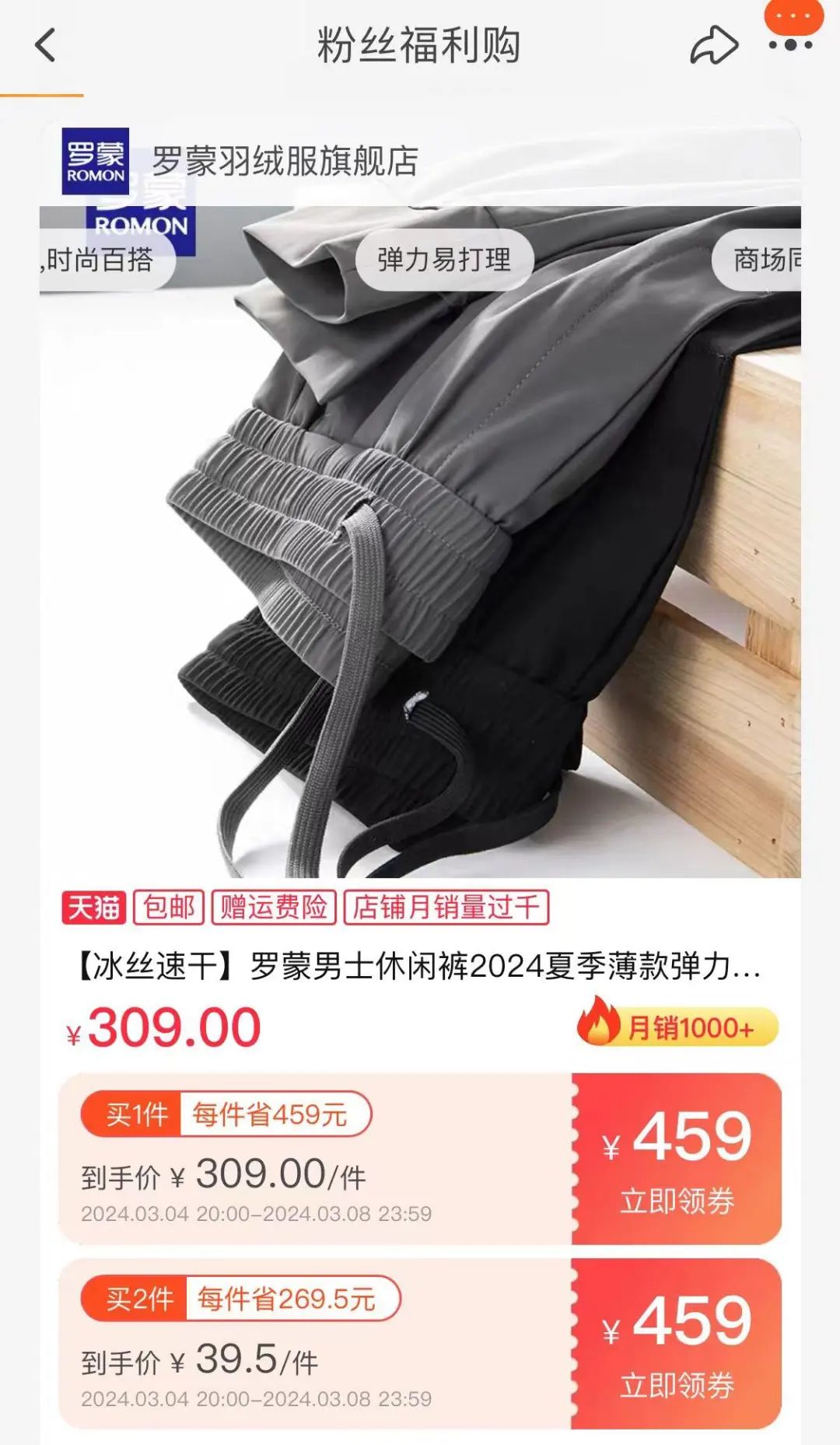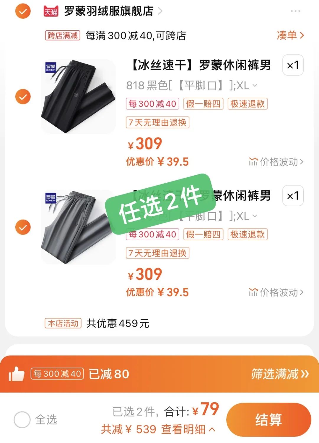 原价309元1件,领459元券,叠加每满300-40元,任选2件,实付79元!
