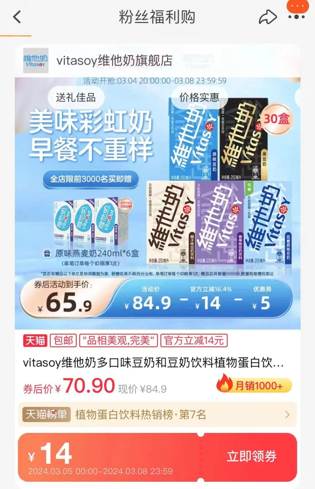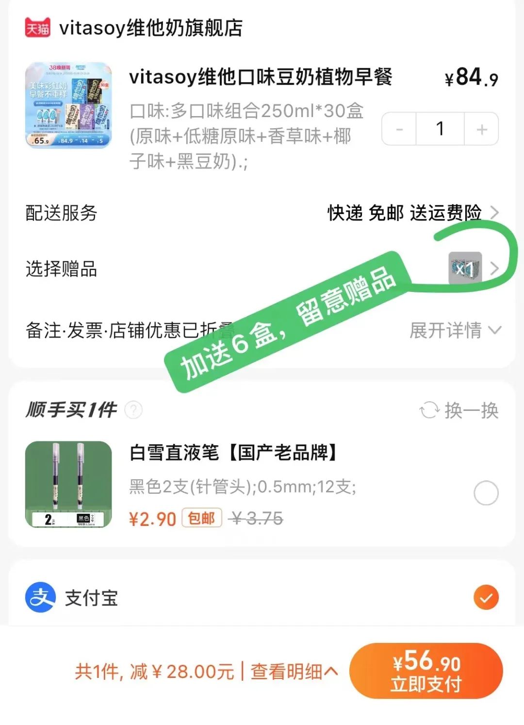 旗舰店,原价84.9元,领14元券,再叠加官方8.36折,实付56.9到手30盒+赠原味燕麦奶6盒,赠品随单显示!