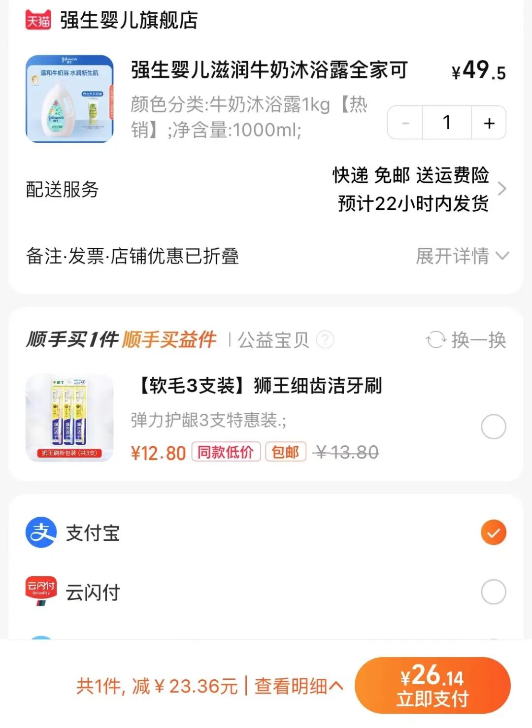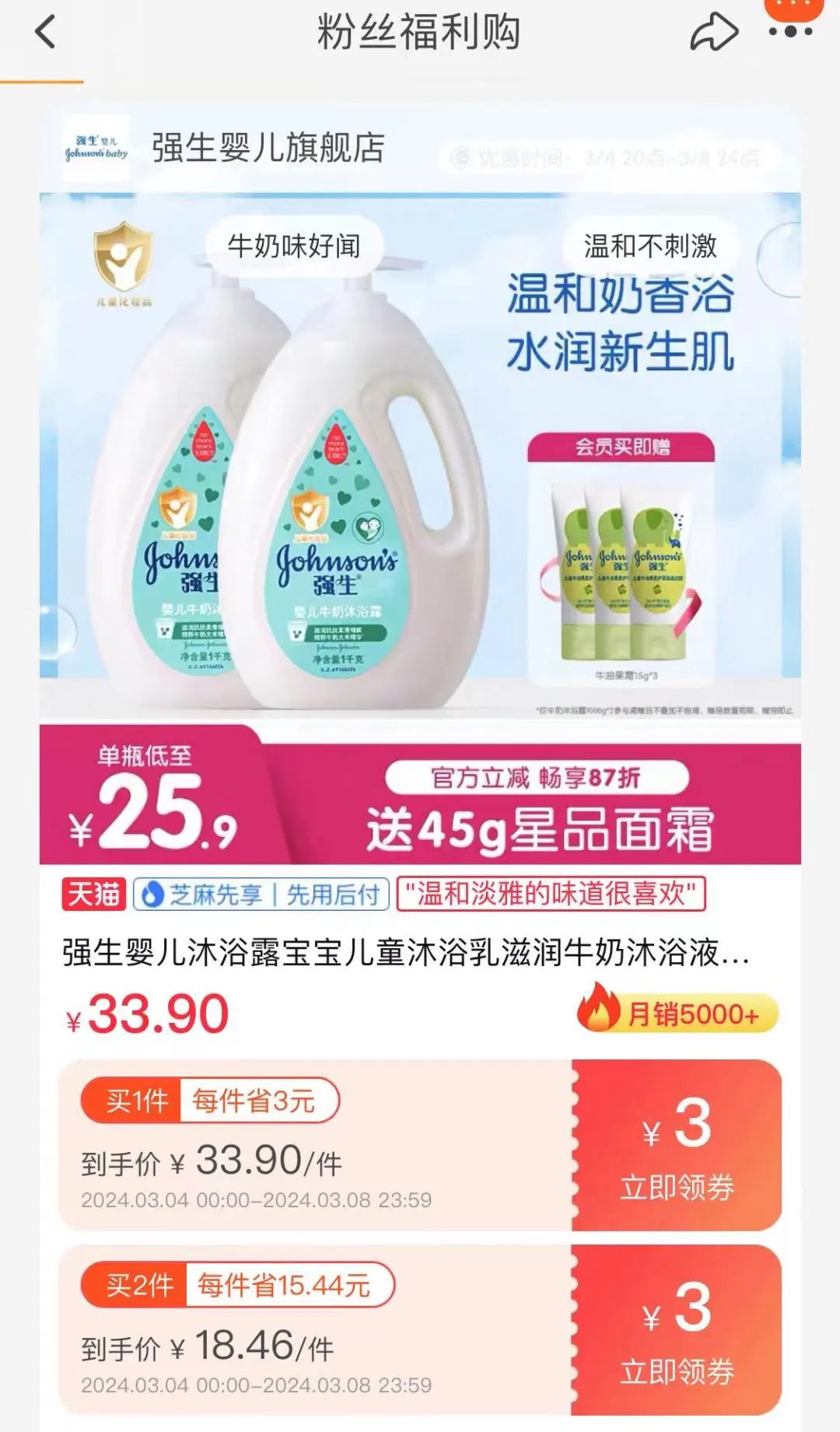旗舰店,原价49.5元,领3元券,叠加满1件7.2折和官方8.7折,实付26.1元到手2斤大瓶装沐浴露!