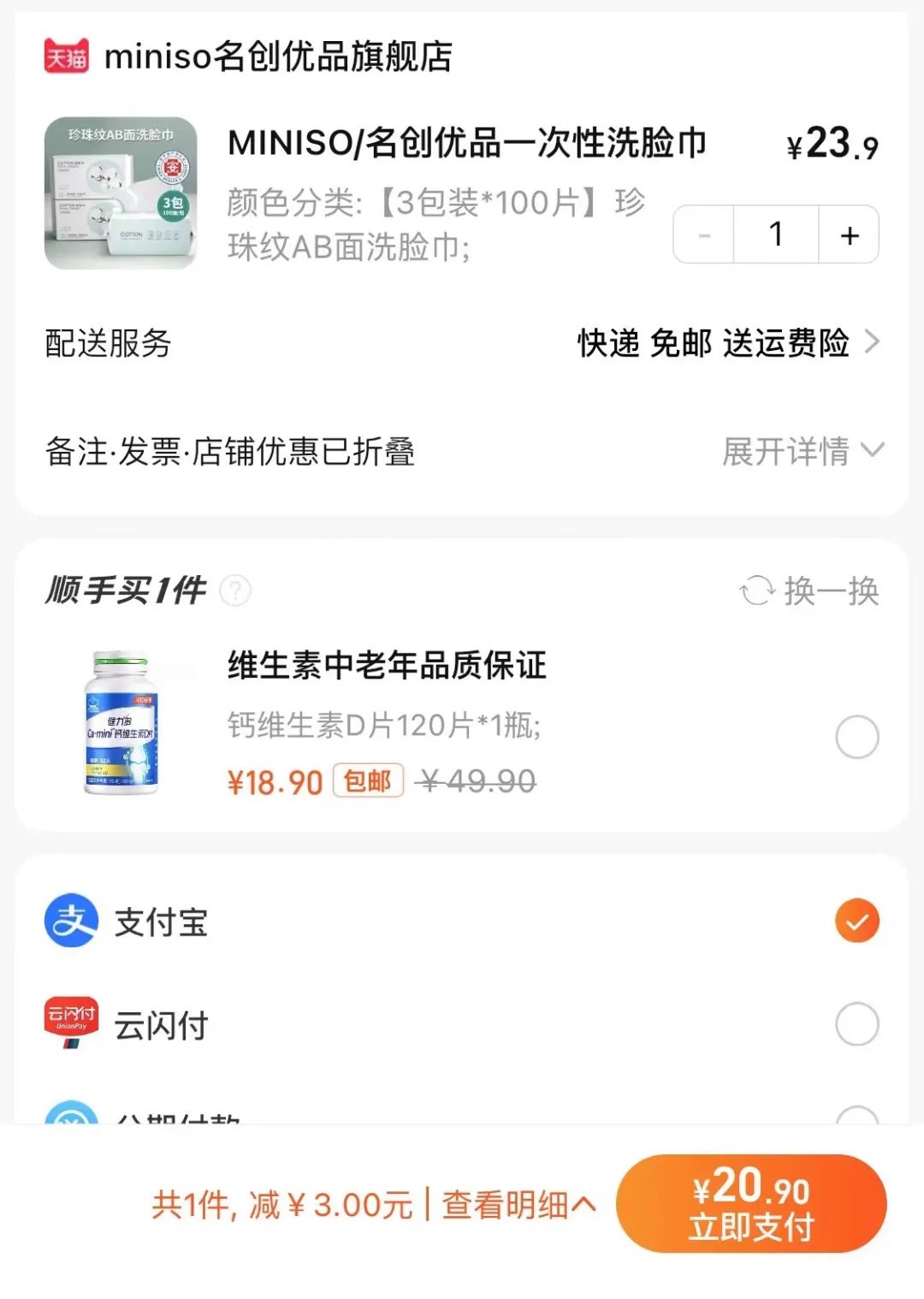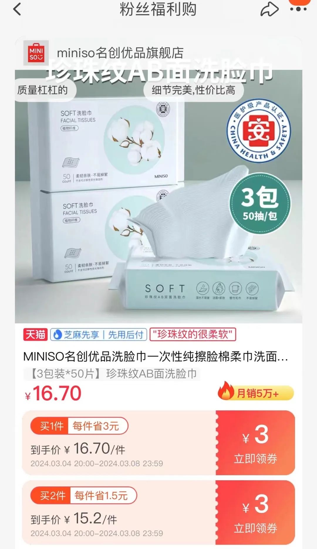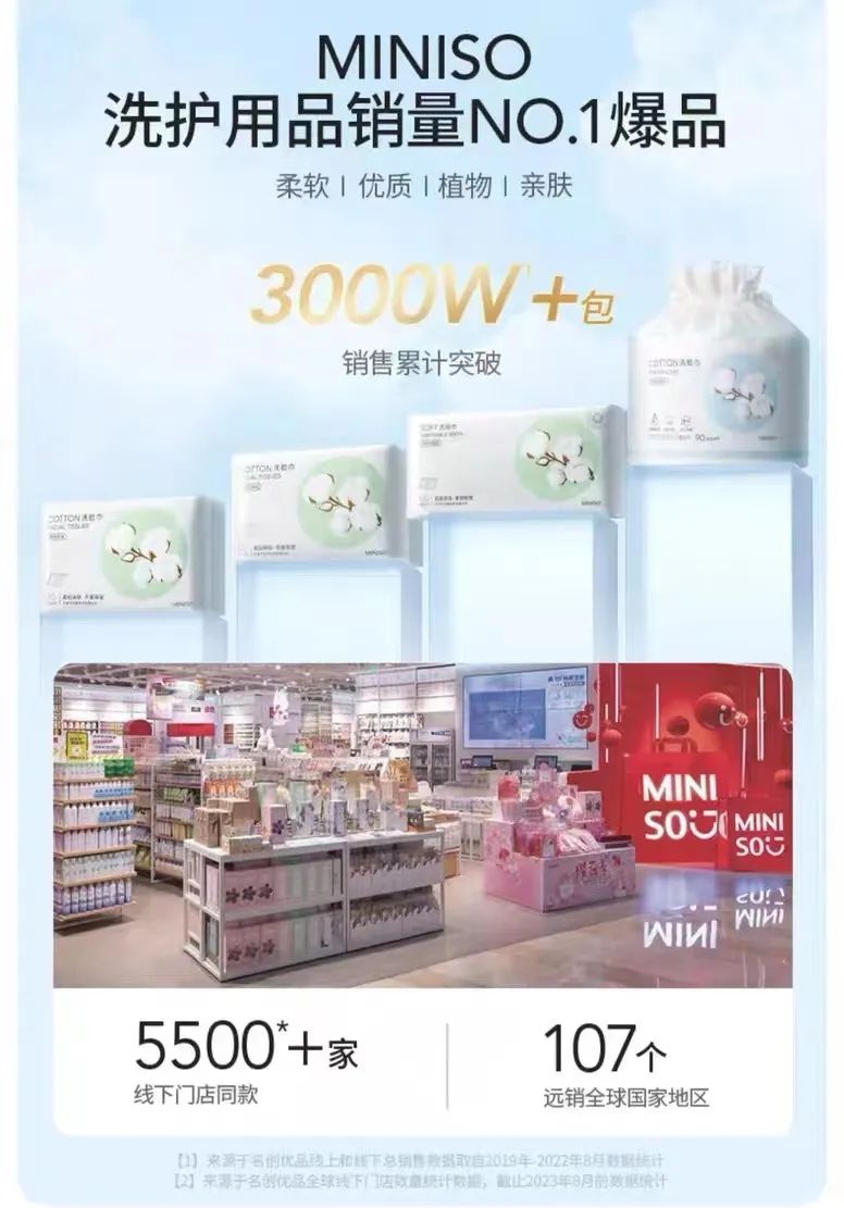 4、MINISO名创优品洗脸巾100片*3包,20.9元
